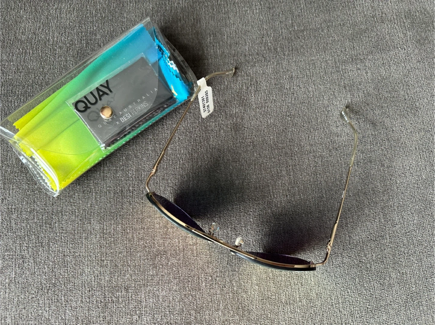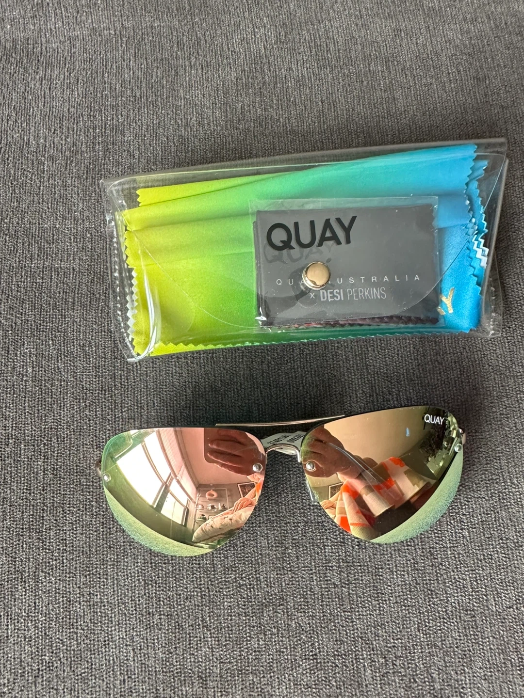 NEW, never used Quay mirrored aviators. The lenses have a pink/gold tint to them. Brand print on left lens. Price tags still on. Comes with sunglasses carrier and 2 new lens cloth. From a smoke free pet free home. Priced to sell, cash only, and pickup only please. I am in Lakeview East by Belmont and Broadway.
