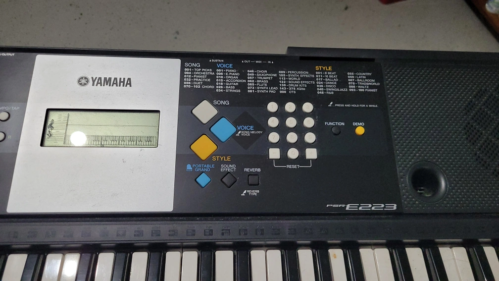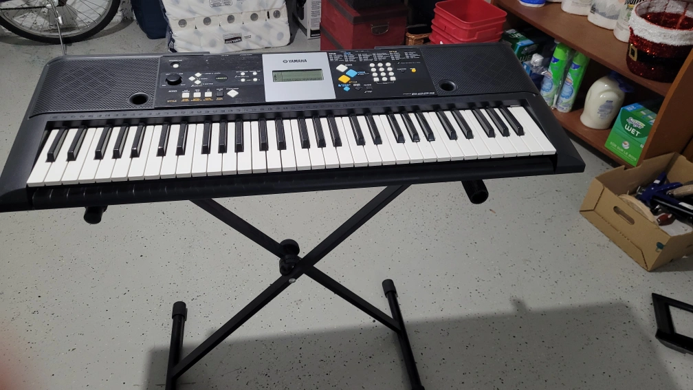 Yamaha PSR-E223 digital keyboard! It's in great shape and comes with a stand for easy setup. Also included is the owner's manual to help you get started. Perfect for beginners or anyone looking for a portable keyboard.