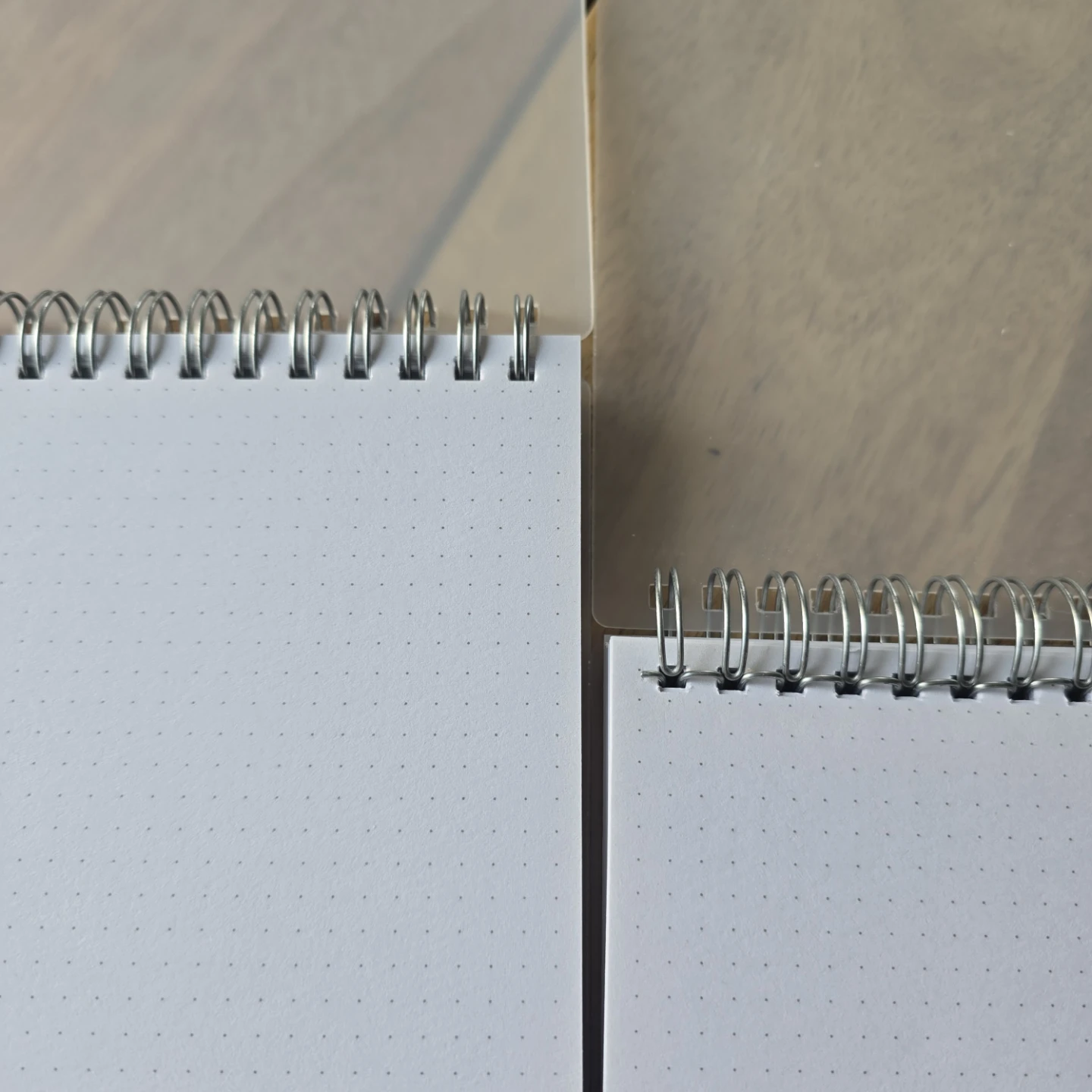 Two spiral-bound notebooks with dot grid pages and clear plastic covers. They're perfect for journaling, sketching, or note-taking. Paper is white with a subtle grey dot pattern. Each notebook is bound with a silver metal spiral. 7in ×10in.