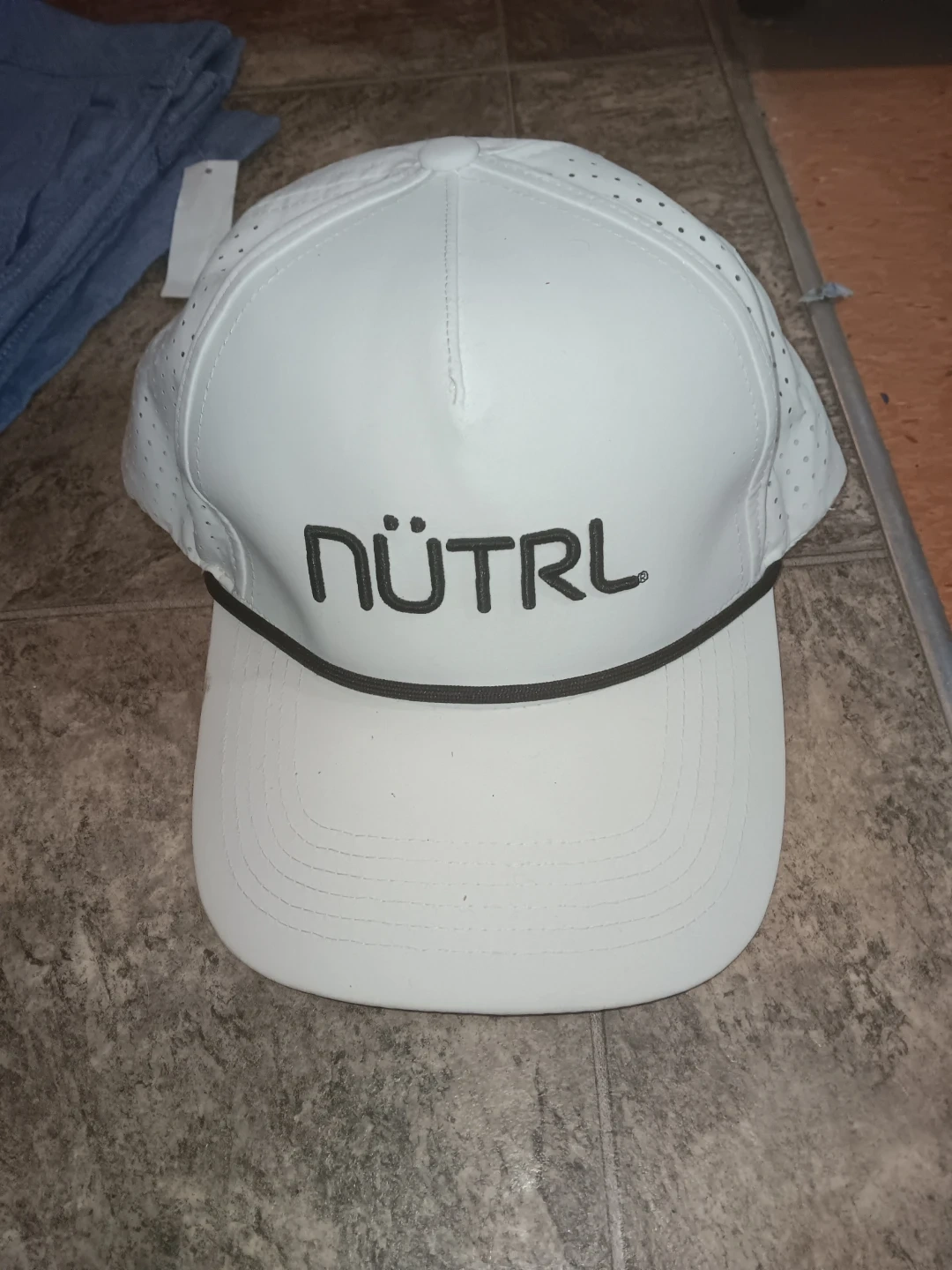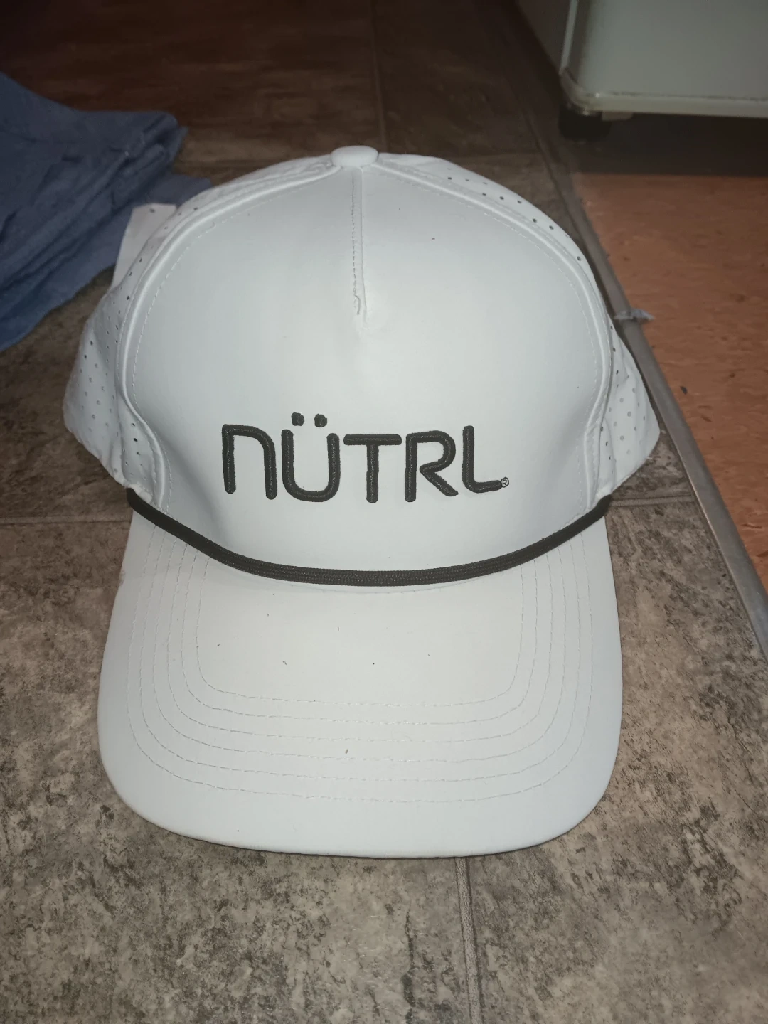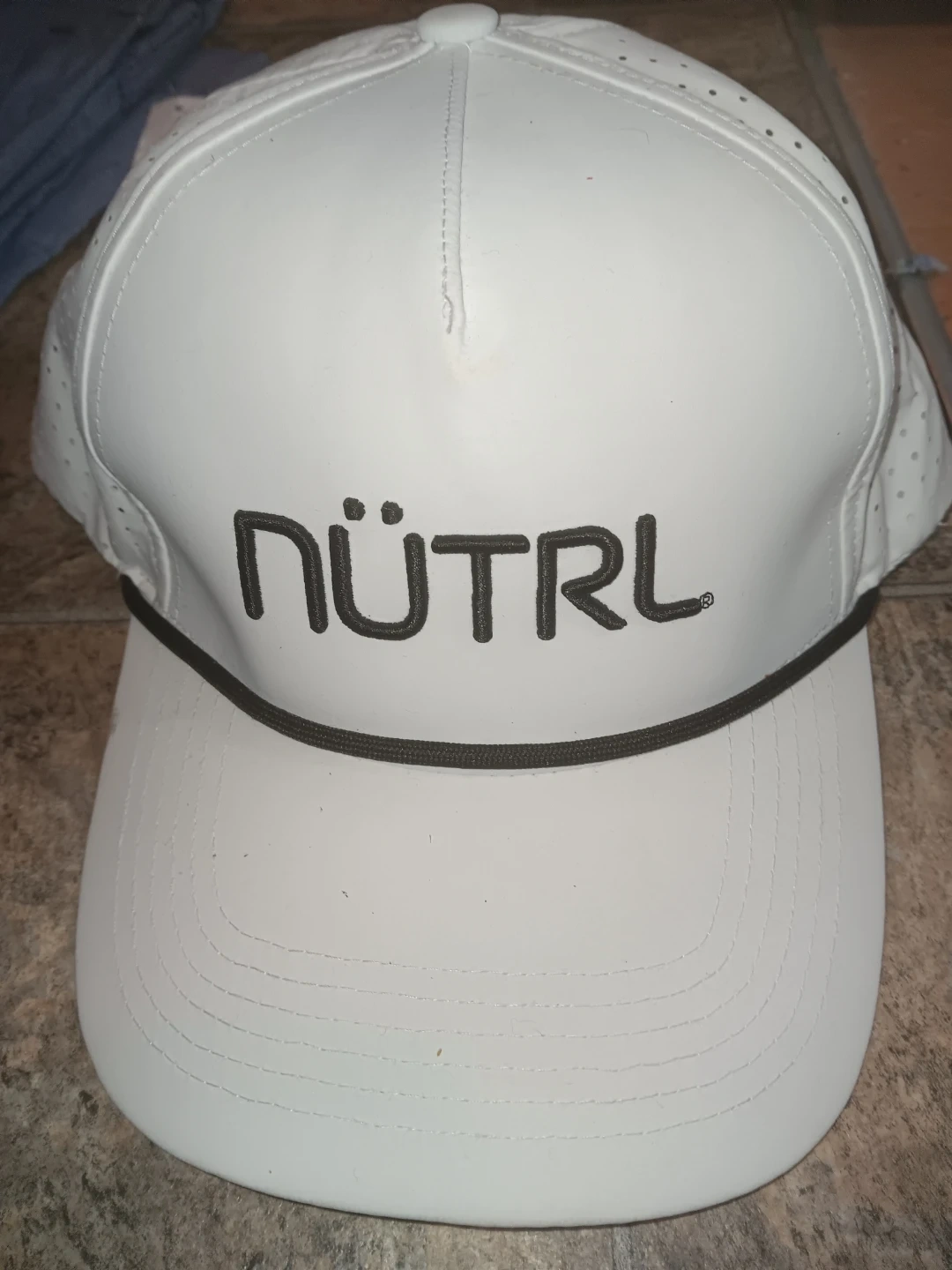This is a white NÜTRL snapback cap. It features a perforated design for breathability and a flat brim with a rope accent. The cap has an adjustable snap closure at the back.