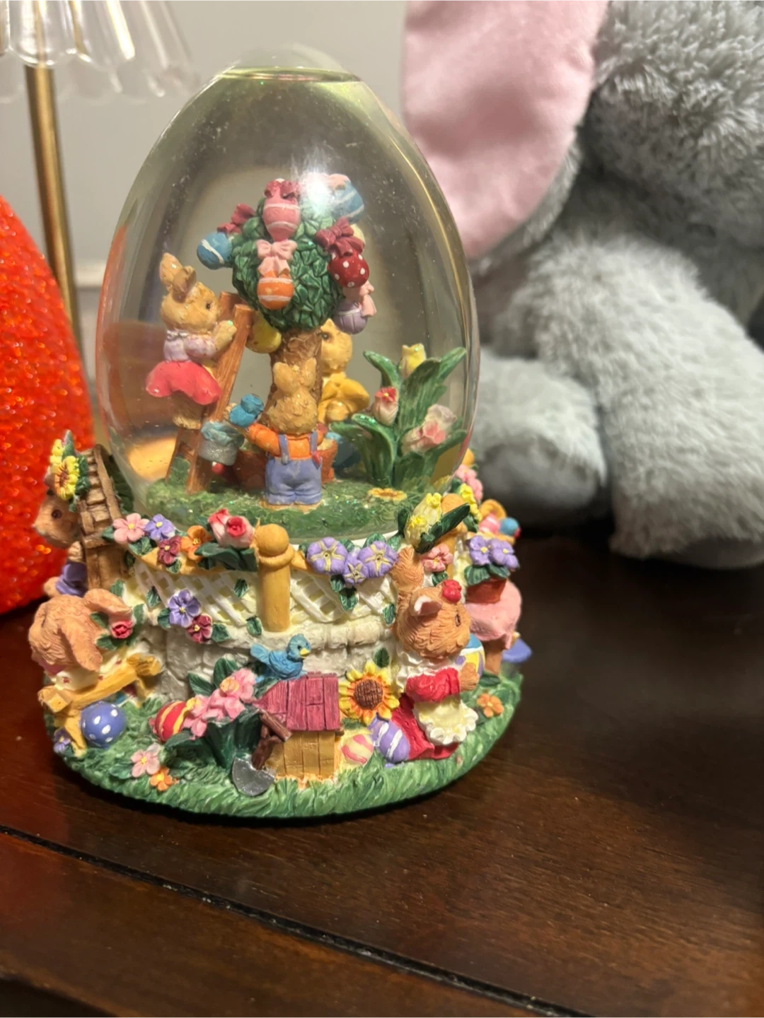 This charming water globe features a festive Easter scene with bunnies and decorated eggs. It's a delightful piece for spring decor. It would be a sweet addition to a shelf or tabletop display.