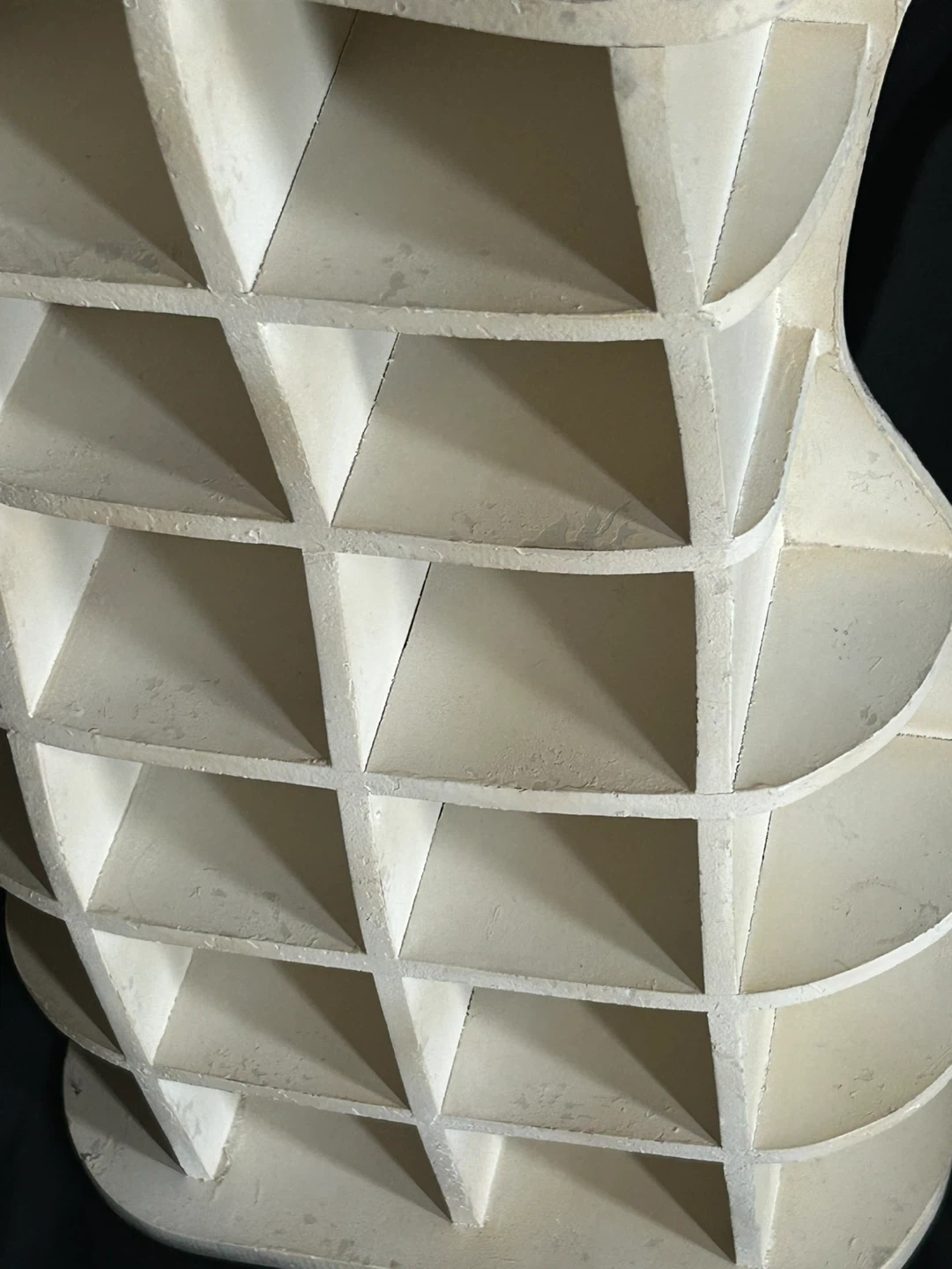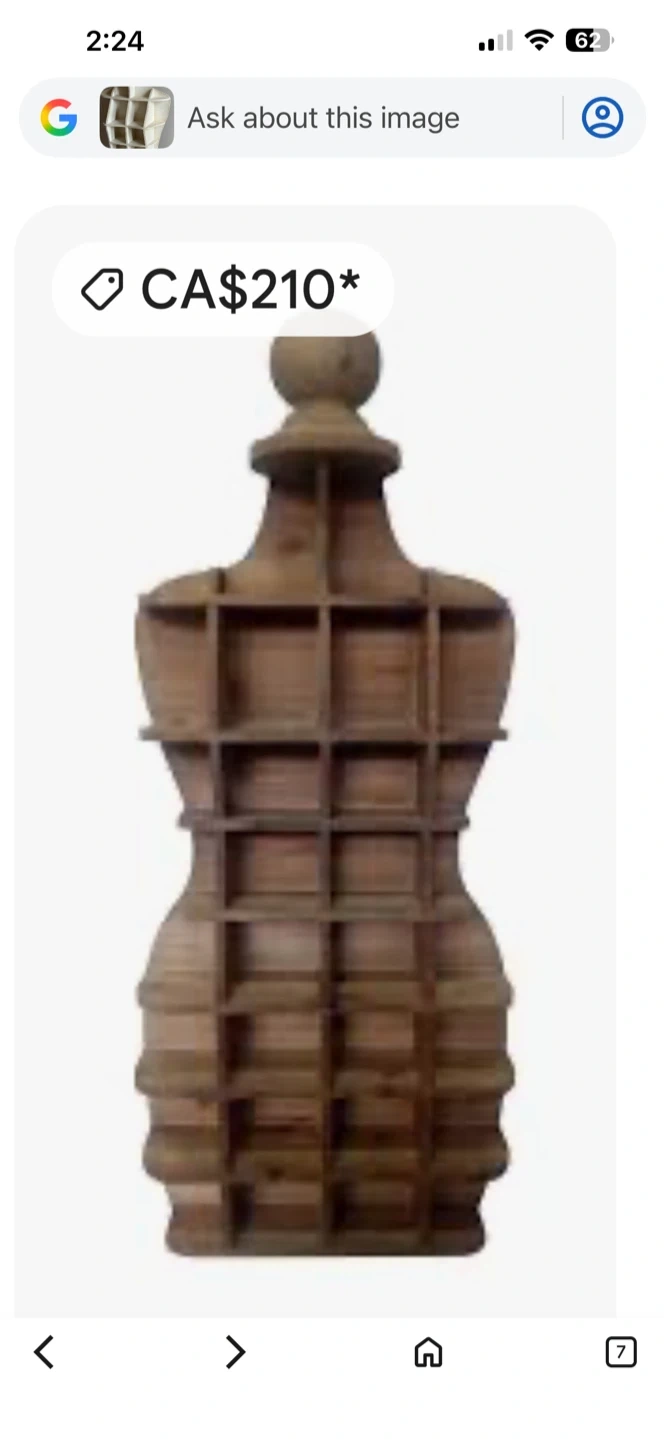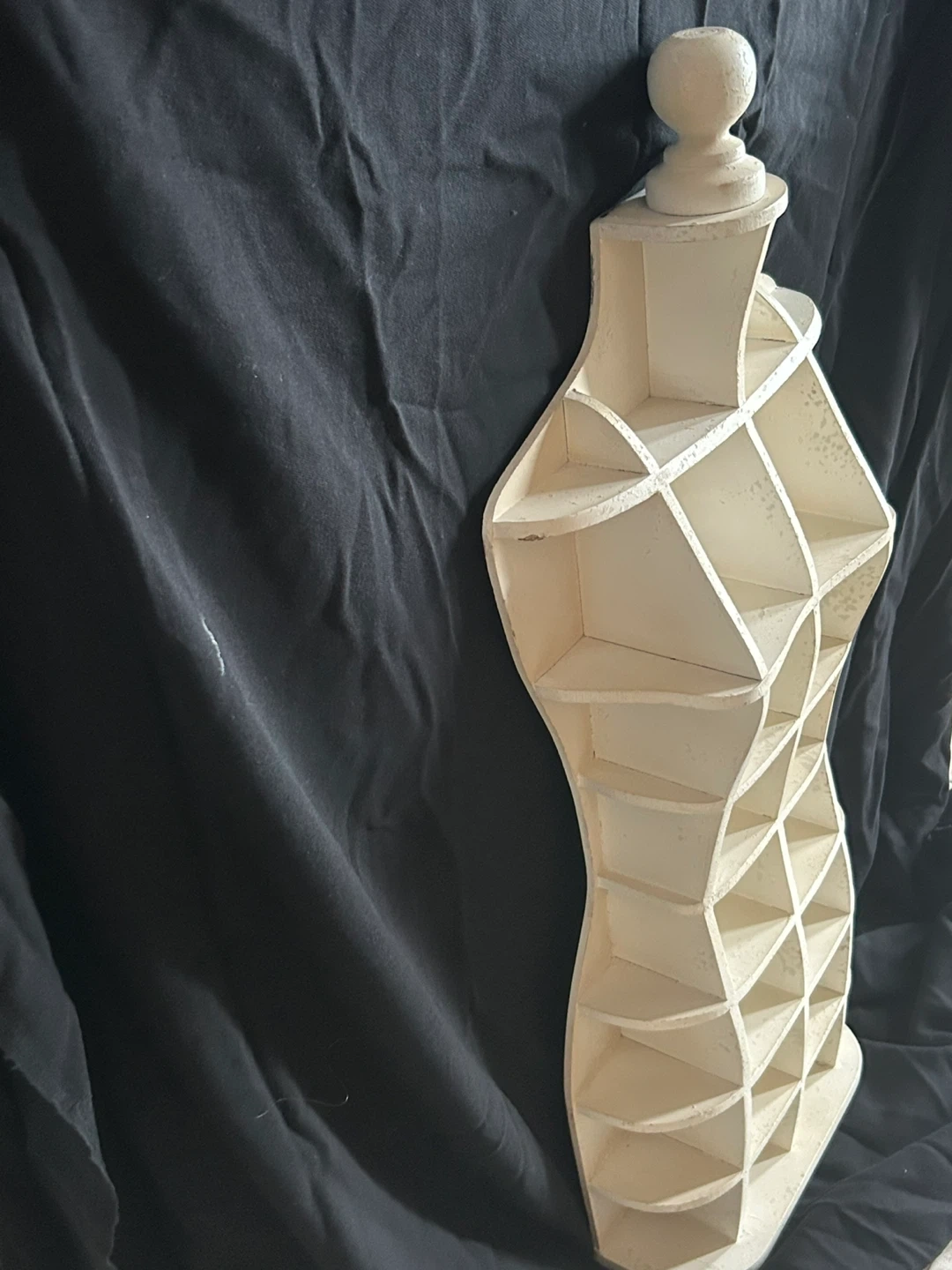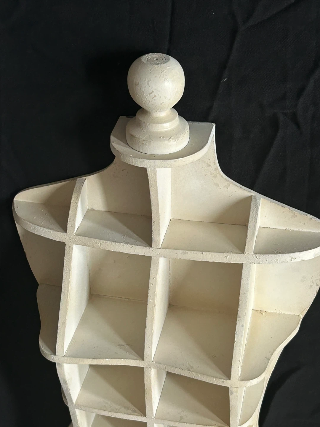 This is a unique shelf unit designed like a mannequin torso. It has multiple compartments for storing small items. Great for a craft room or retail display!