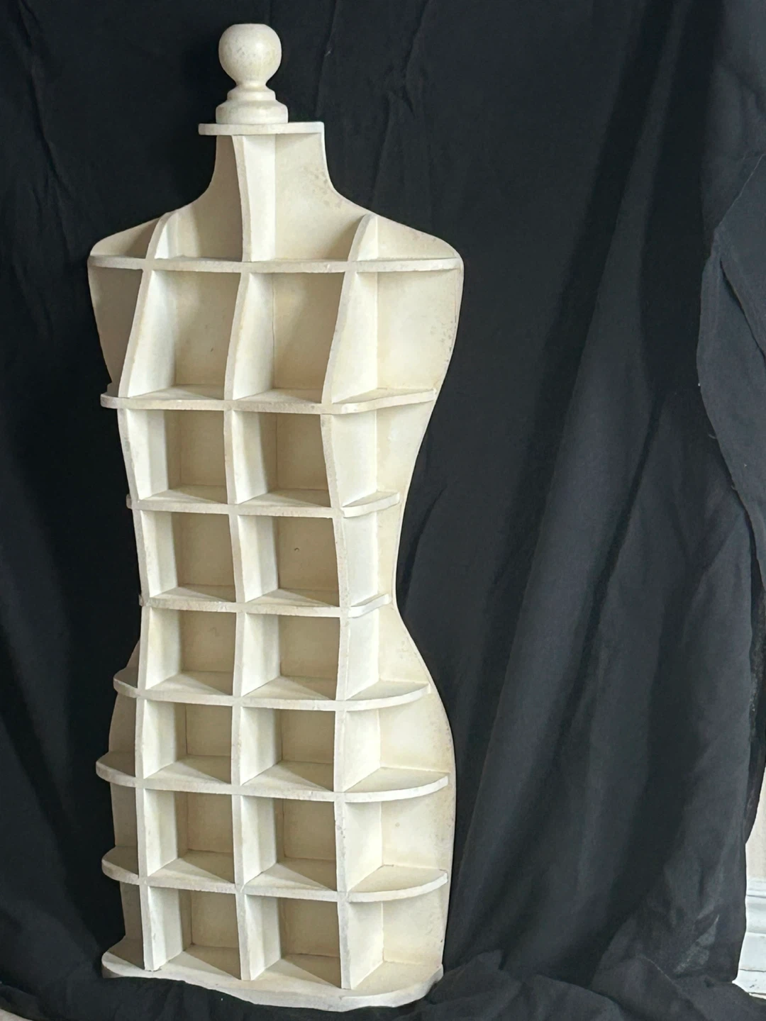 This is a unique shelf unit designed like a mannequin torso. It has multiple compartments for storing small items. Great for a craft room or retail display!