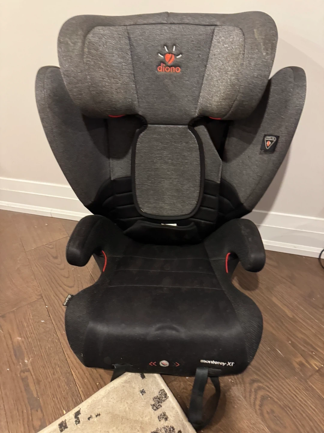 Selling a Diono Monterey XT booster car seat! It's in good condition and ready for a new rider. The seat is black and grey, and the headrest is adjustable for growing kids