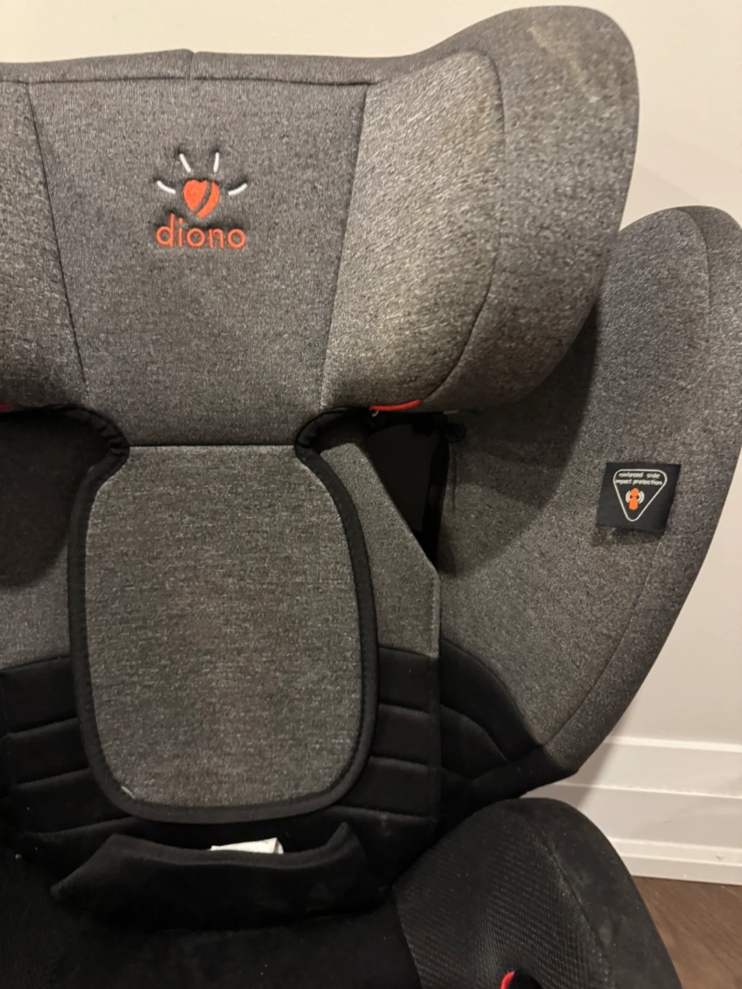 Selling a Diono Monterey XT booster car seat! It's in good condition and ready for a new rider. The seat is black and grey, and the headrest is adjustable for growing kids