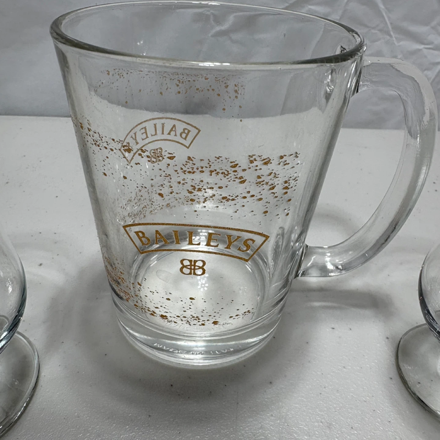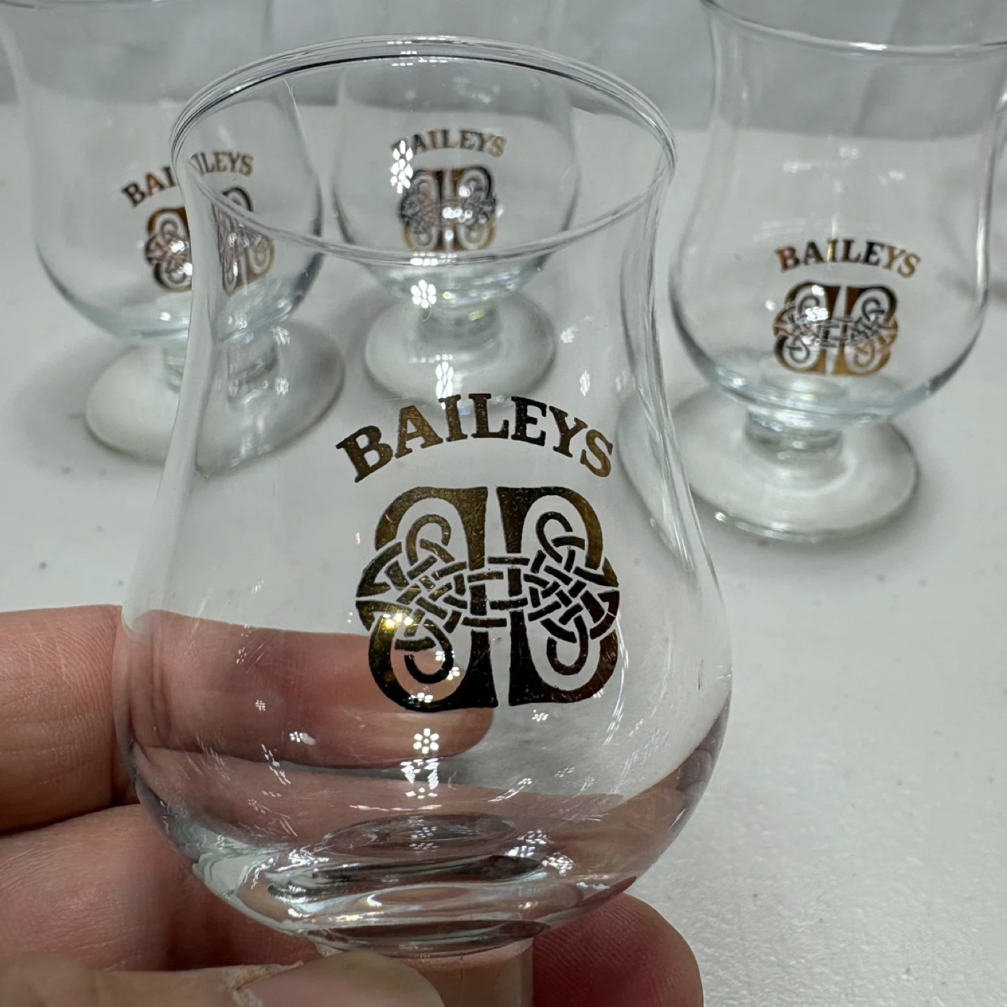 A set of five Baileys branded glasses, including one mug and four small stemmed glasses. They're clear glass with the gold Baileys logo and decorative speckles. These are great for enjoying your favourite liqueurs!