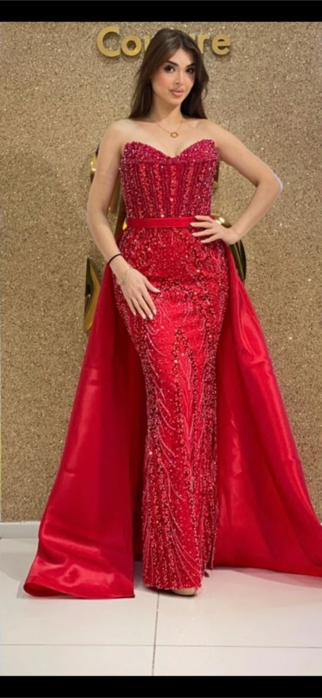 Stunning red sequin gown with a sweetheart neckline and a dramatic detachable satin skirt. It's strapless and features intricate beadwork throughout the bodice and fitted skirt. Perfect for formal events and galas!