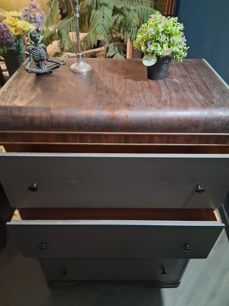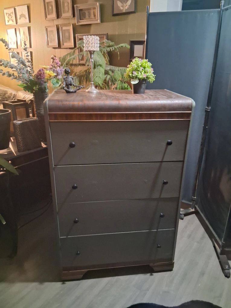 Selling a vintage chest of drawers with four spacious drawers! It has a unique curved top and a nice, neutral colour that would fit well in any room. It's in good condition for its age