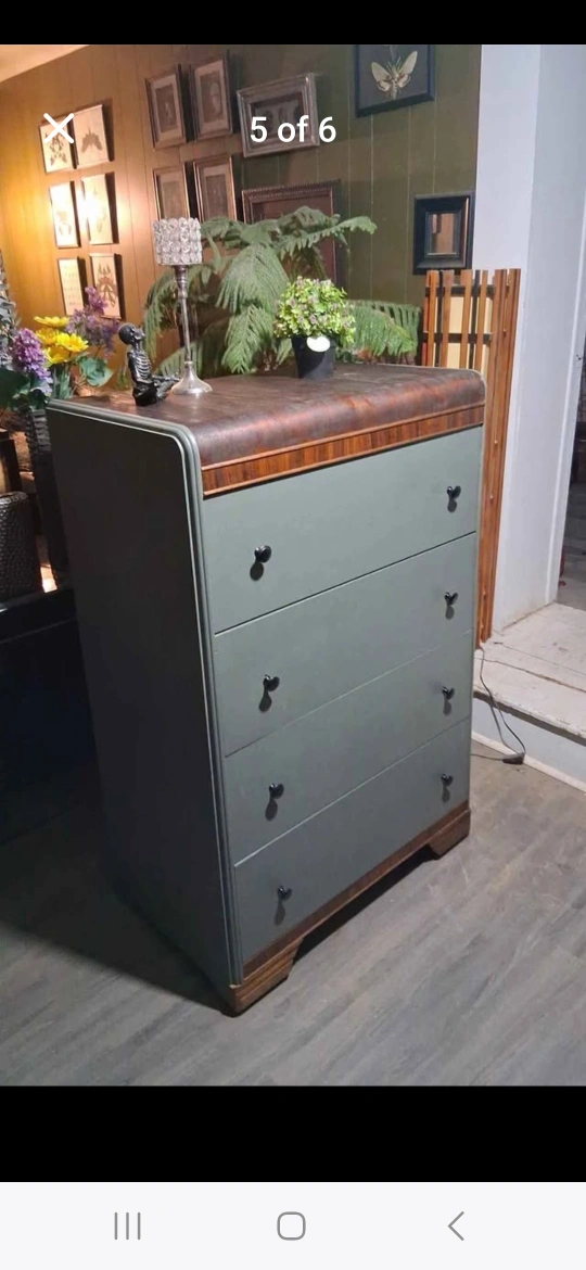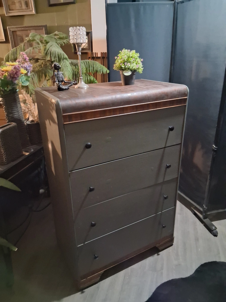 Selling a vintage chest of drawers with four spacious drawers! It has a unique curved top and a nice, neutral colour that would fit well in any room. It's in good condition for its age