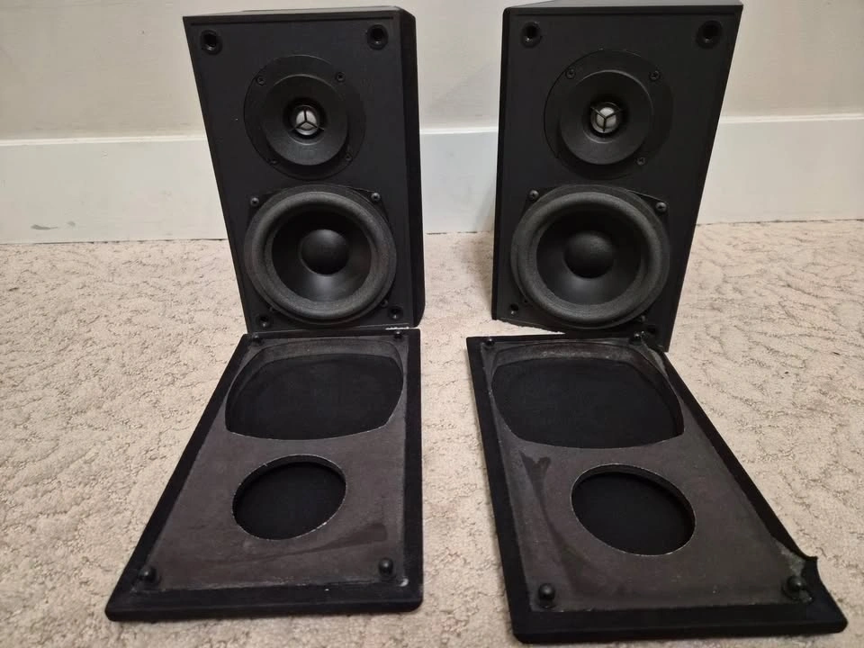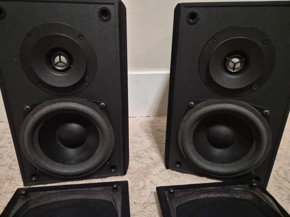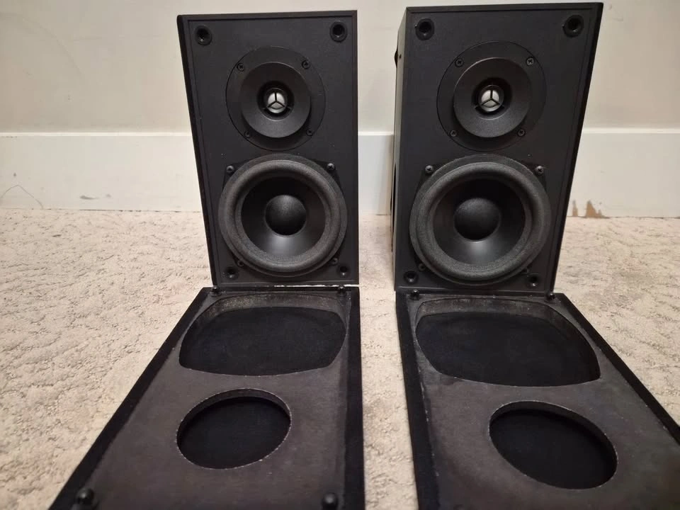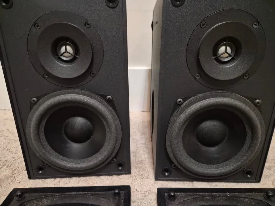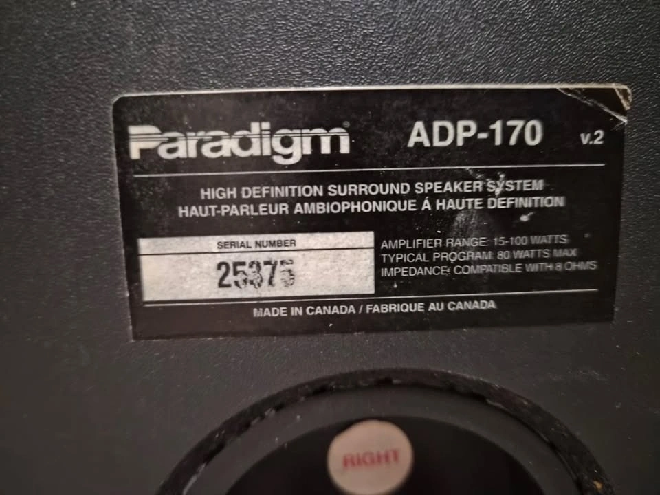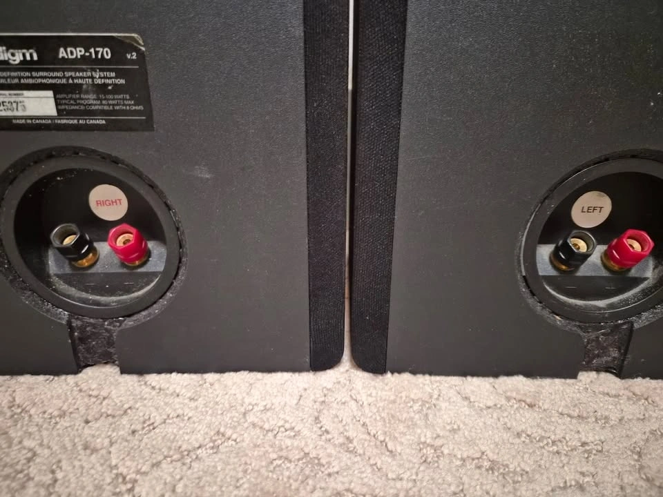 Great sounding. Moving to larger speakers, hence selling. These are Adapted Dipole (ADP) speakers, meaning they are designed specifically for surround effects rather than direct-firing music. They are highly sought after by budget home theater enthusiasts because they create a "diffuse" soundstage that is hard to get with standard bookshelf speakers. Drivers: Two 0.75-inch dome tweeters and two 5.5-inch woofers. Frequency Response: ±2dB from 90 Hz to 20 kHz. Power Handling: 15 – 100 Watts at 8 Ohms. Dimensions: 10.75 inches high and 9.5 inches wide. Weight: Each speaker weighs 12 pounds. Construction: Made in Canada with gold-plated binding posts. These speakers are designed for a wide, immersive sound field, making them suitable for home theater setups.