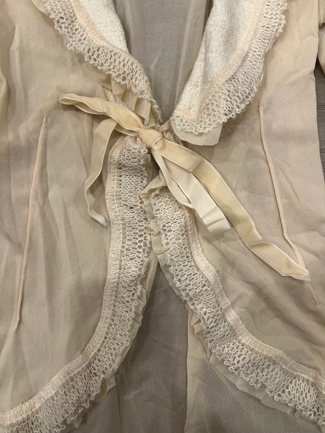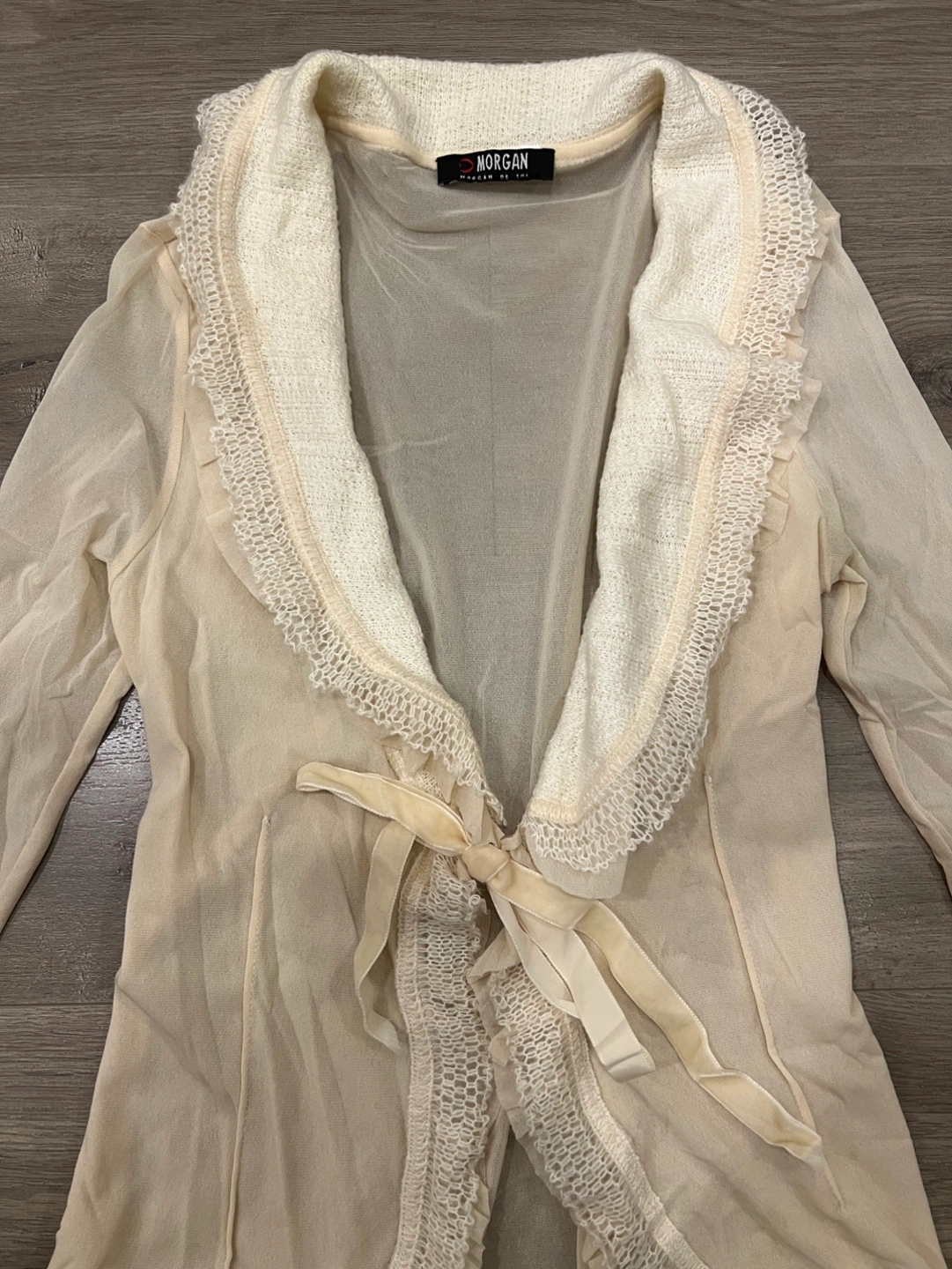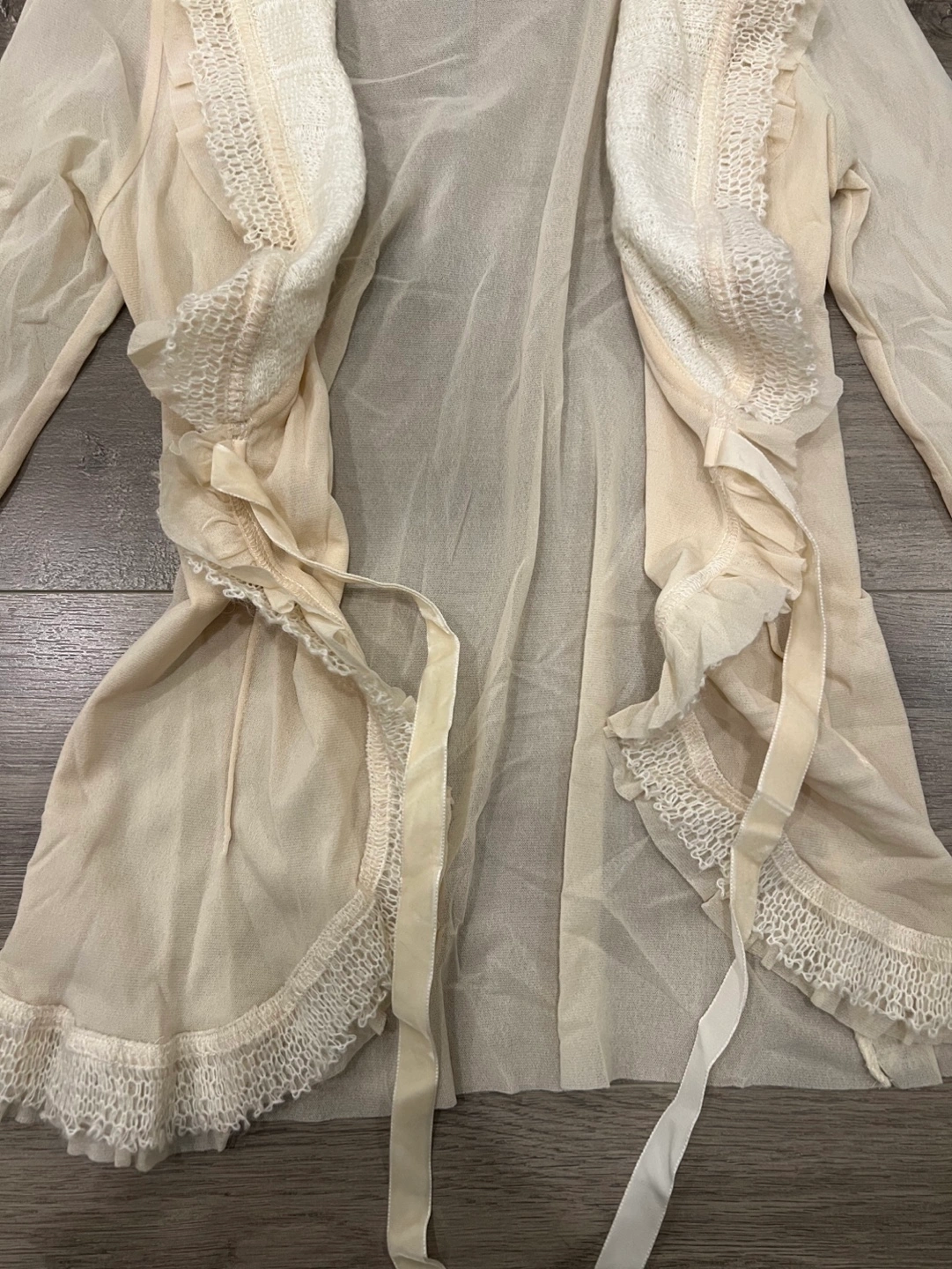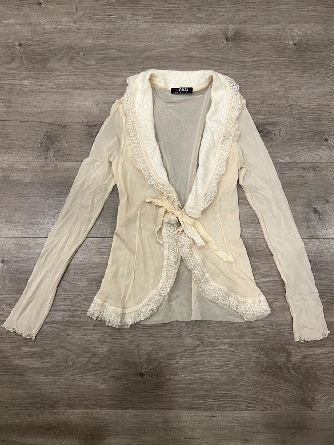 Lightweight sheer cardigan. Features a lace trim and tie-front detail. Long sleeves. Creamy beige colour. Small.