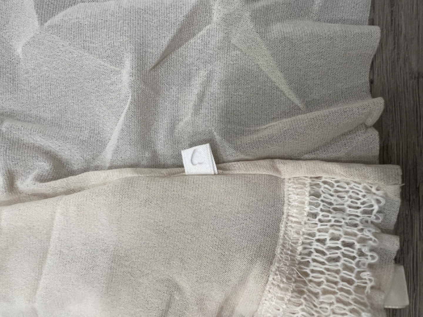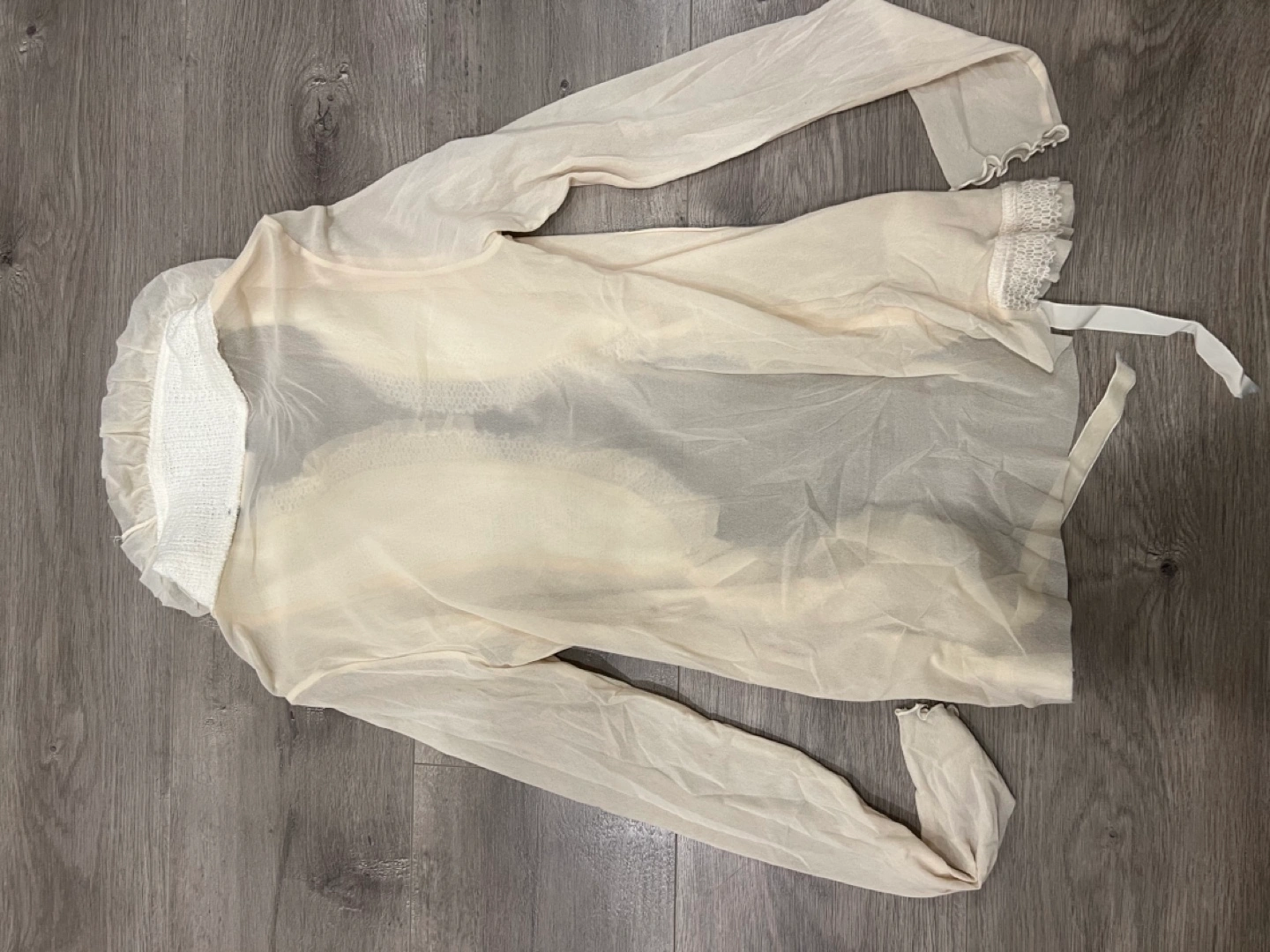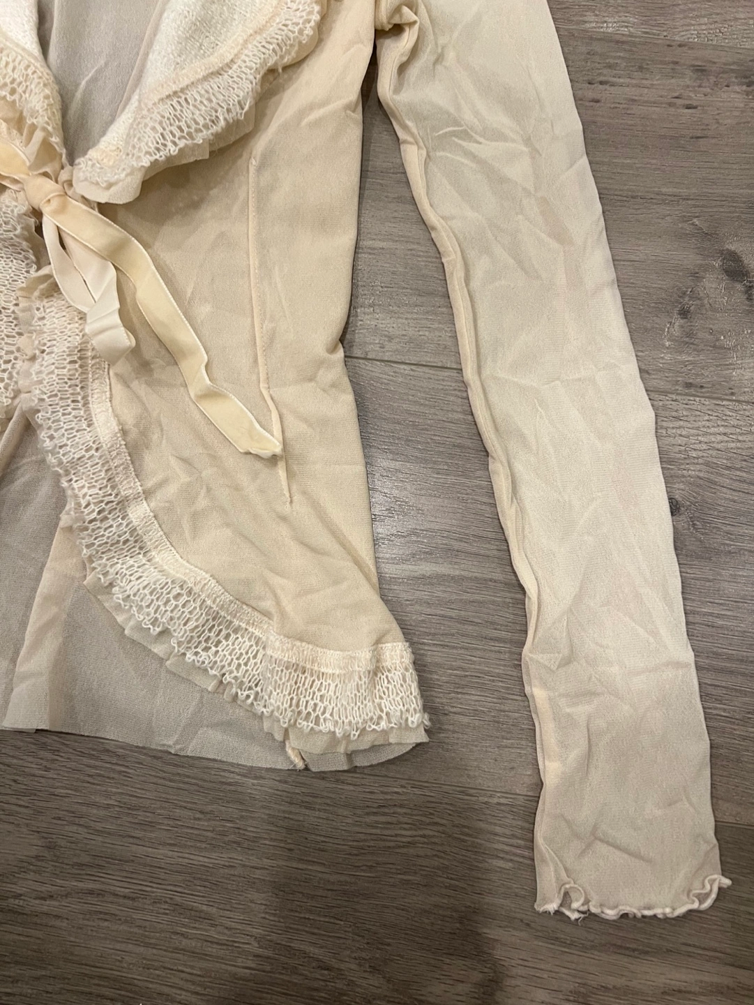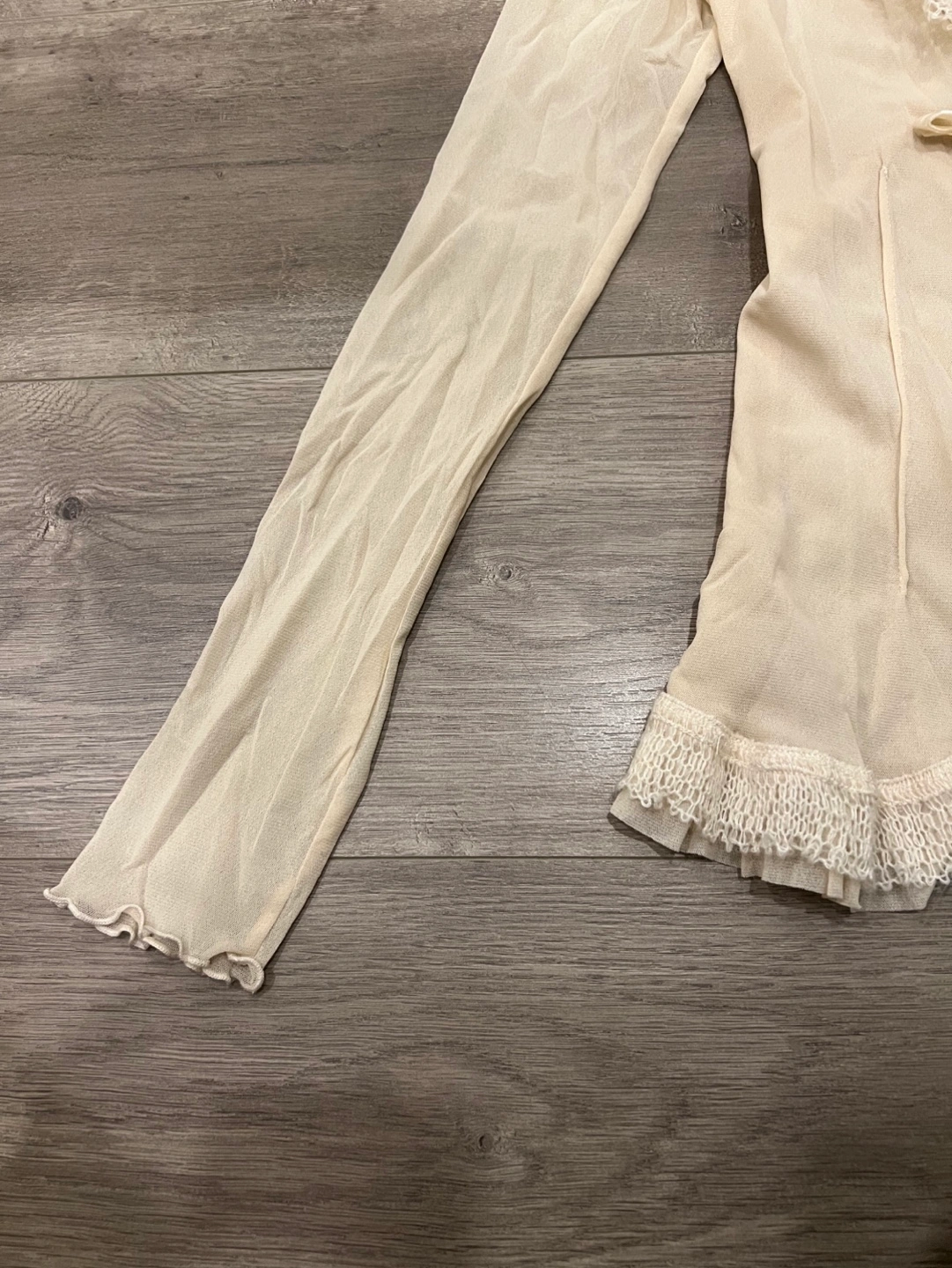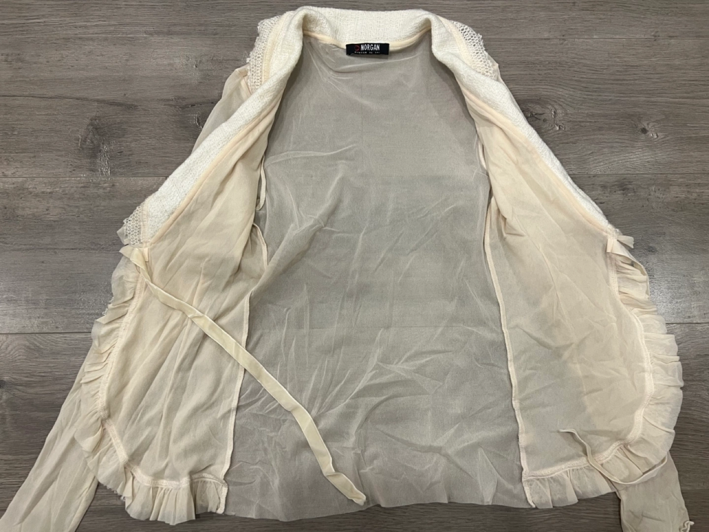 Lightweight sheer cardigan. Features a lace trim and tie-front detail. Long sleeves. Creamy beige colour. Small.