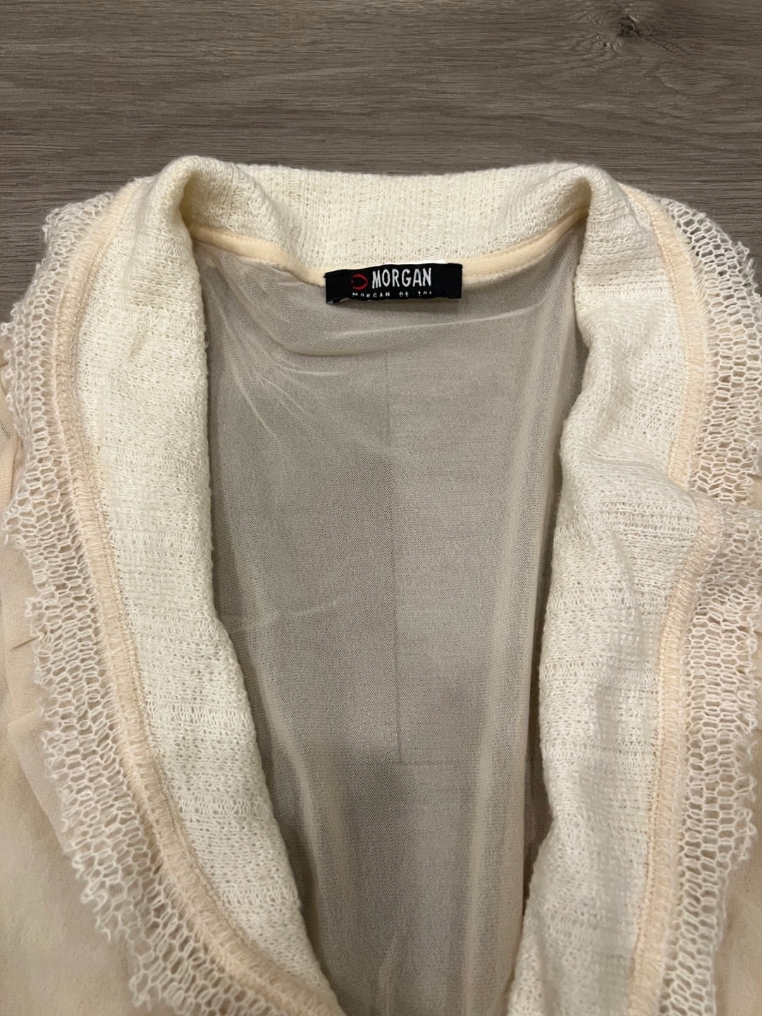 Morgan de Toi Beige Sheer Cardigan with Lace Detail