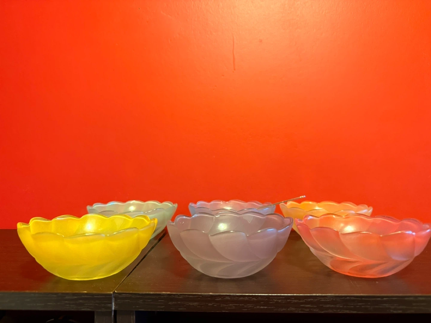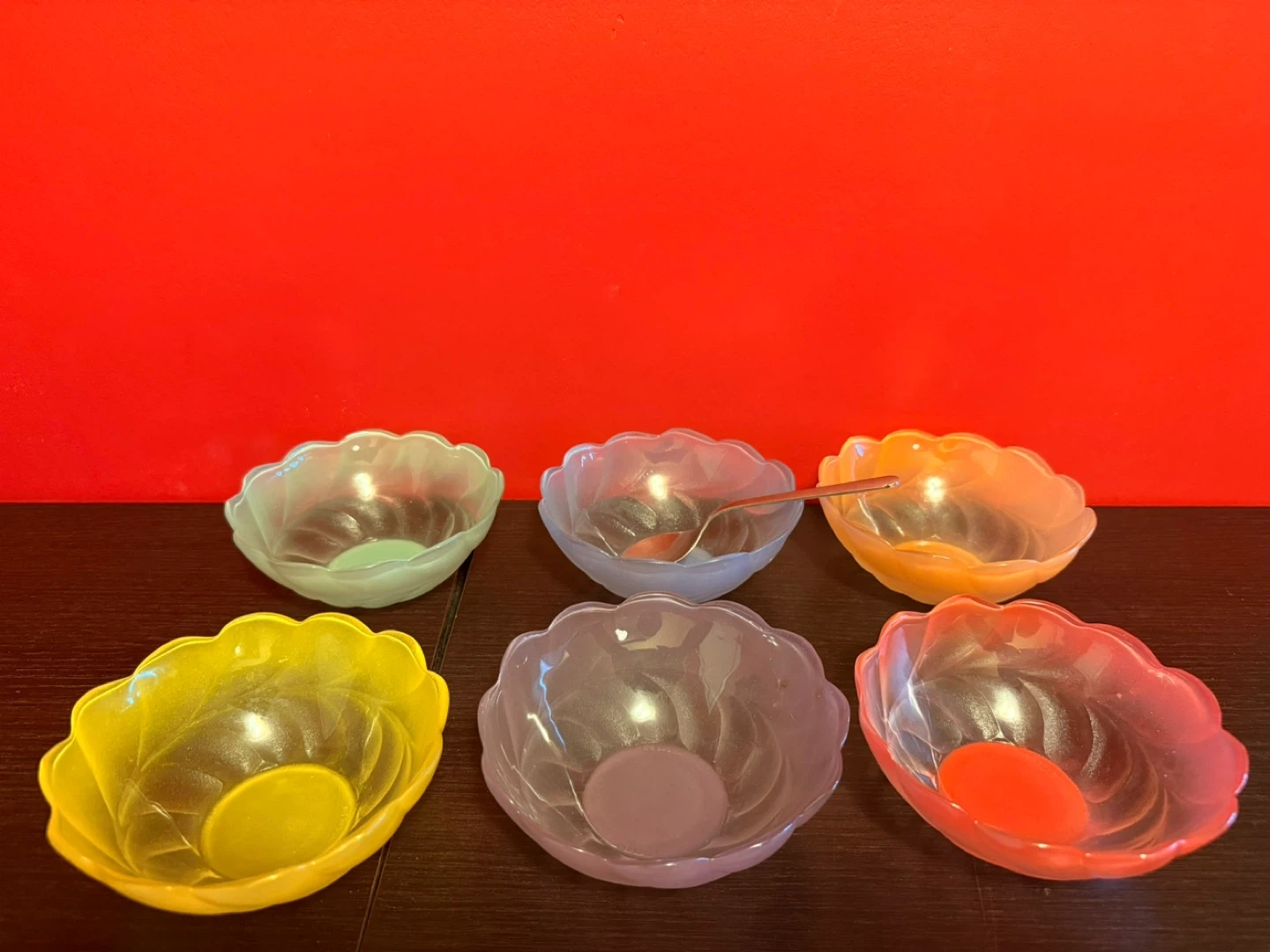 This is a set of six small dessert bowls. They come in various translucent colours including yellow, mint green, purple, pink, and orange. Each bowl has a fluted rim. Perfect for individual servings of ice cream or fruit salad!