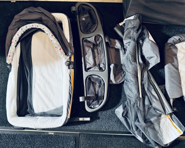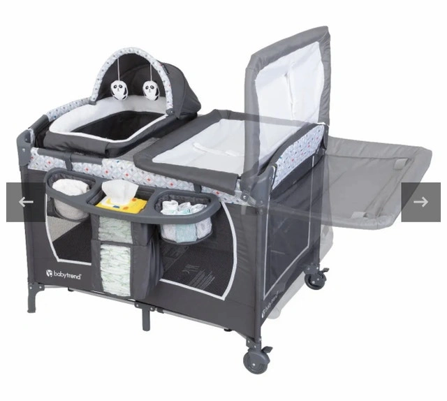 Used playard / nursery center with mattress and bed sheet. It was only used at home very carefully. There is a small hole in the lower part of the changing mat, only visible from below (see photo).