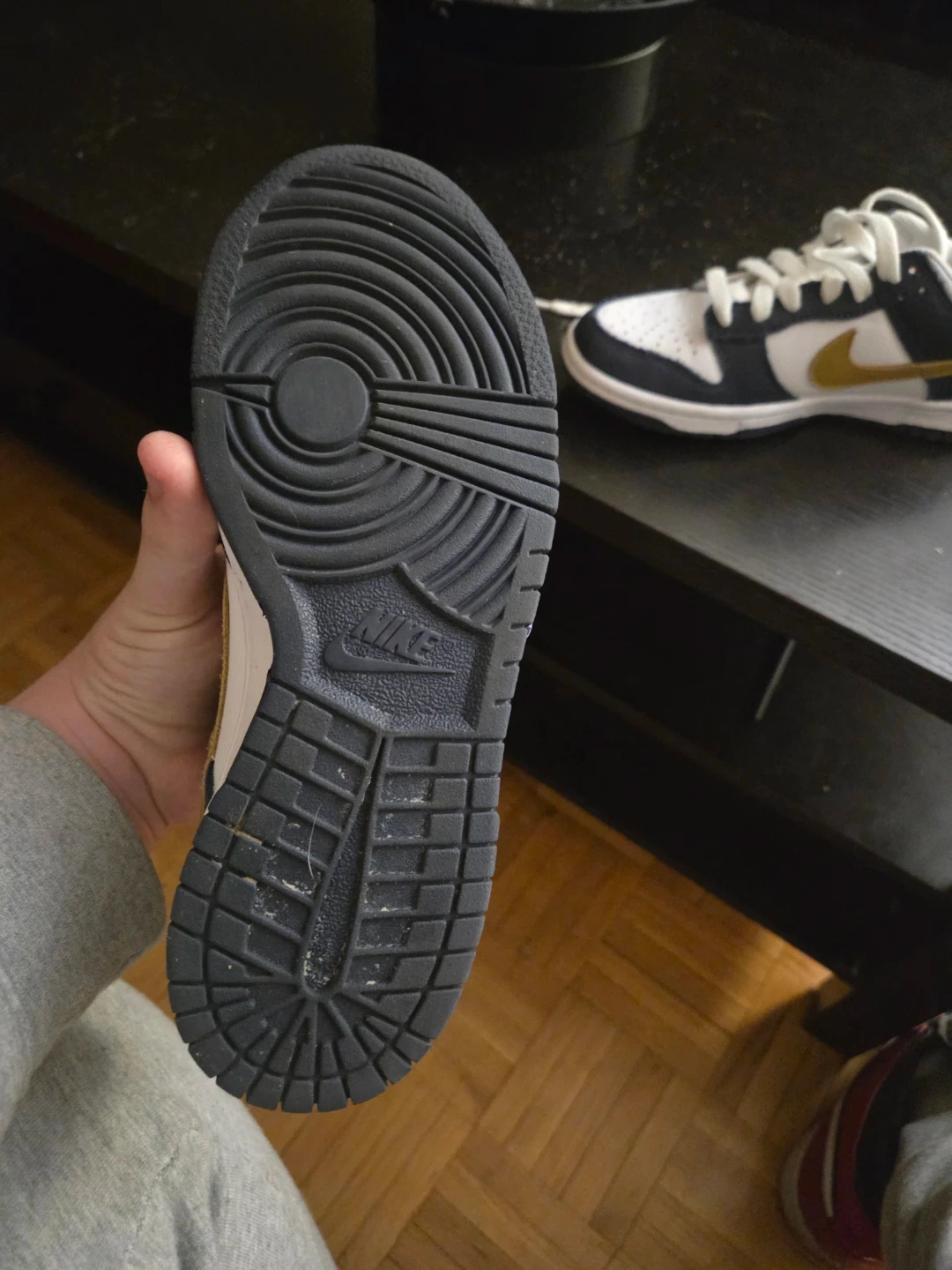 Selling a pair of Nike Dunk Low shoes in a white and gold colourway. They are in good condition, with some signs of wear on the soles. Great for everyday wear!