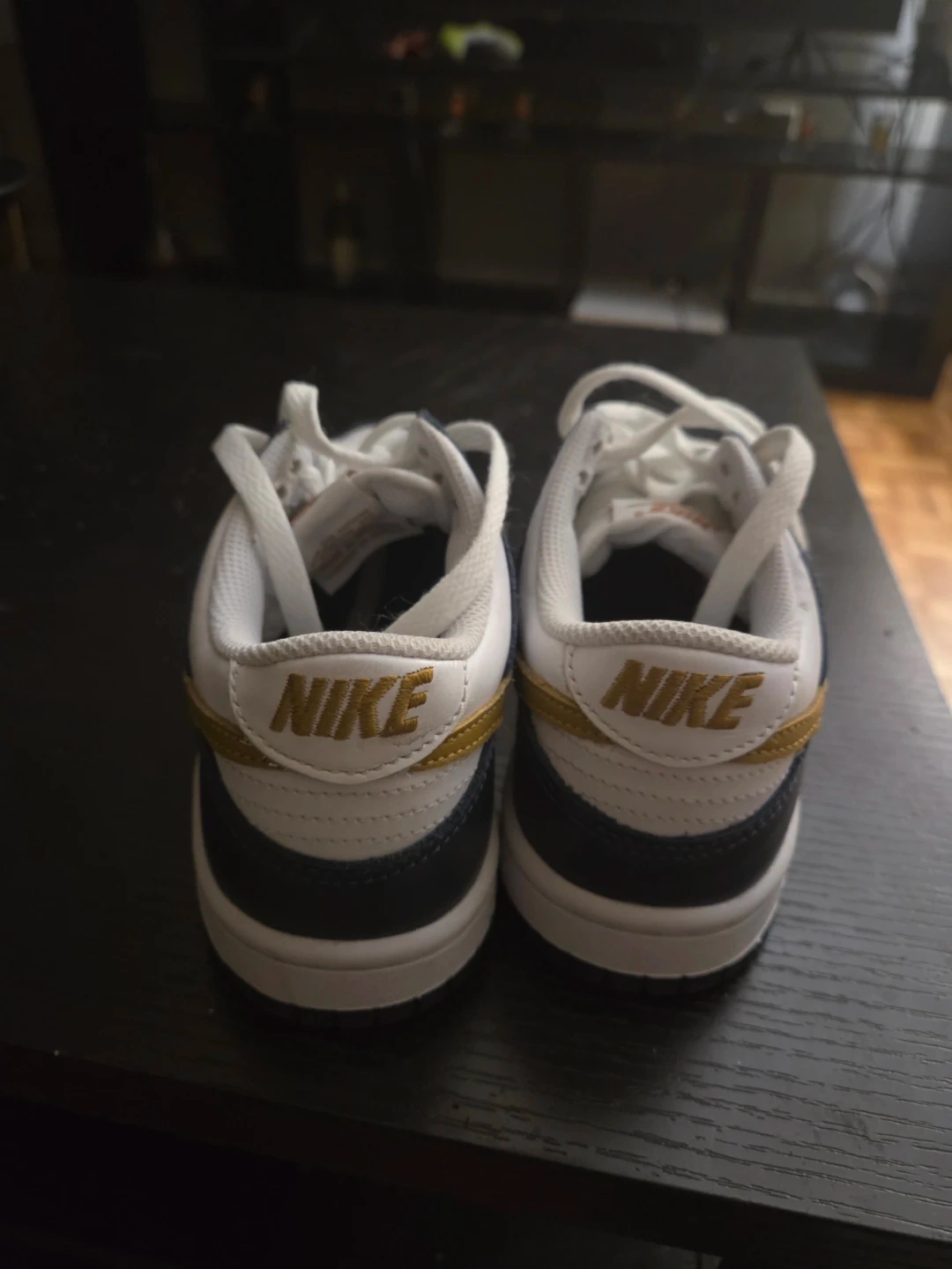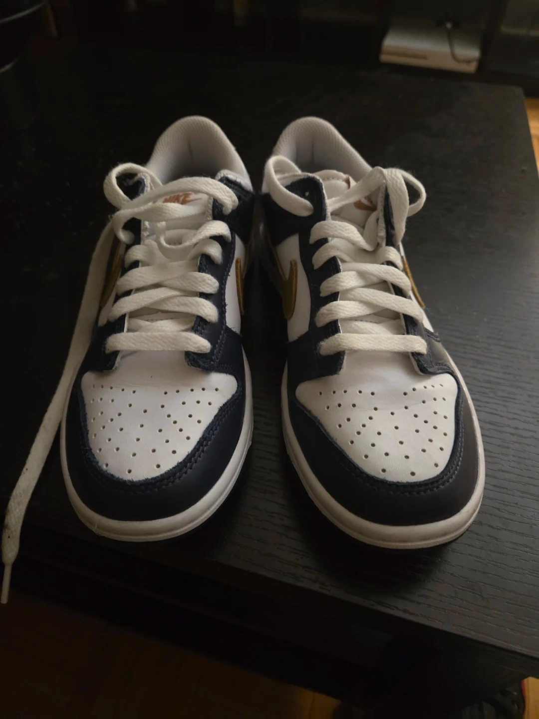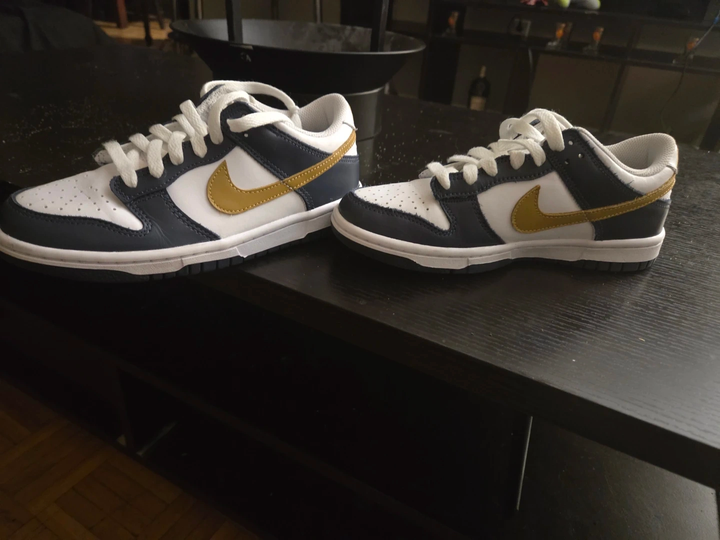 Selling a pair of Nike Dunk Low shoes in a white and gold colourway. They are in good condition, with some signs of wear on the soles. Great for everyday wear!