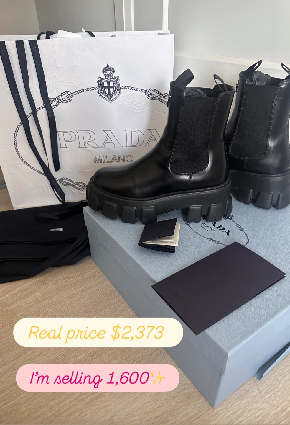 1,600 …These Prada ankle boots are in great condition (9/10 just because I used a couple of times) and come with the original box. They feature a sleek black leather exterior and a comfortable, stylish design. A great addition to any wardrobe! Real price $2,373.00… I am selling just 1,600