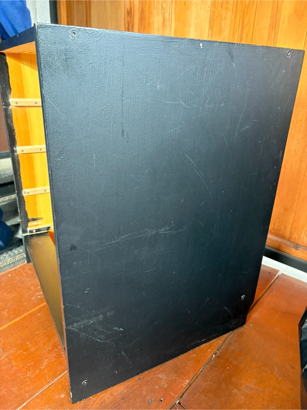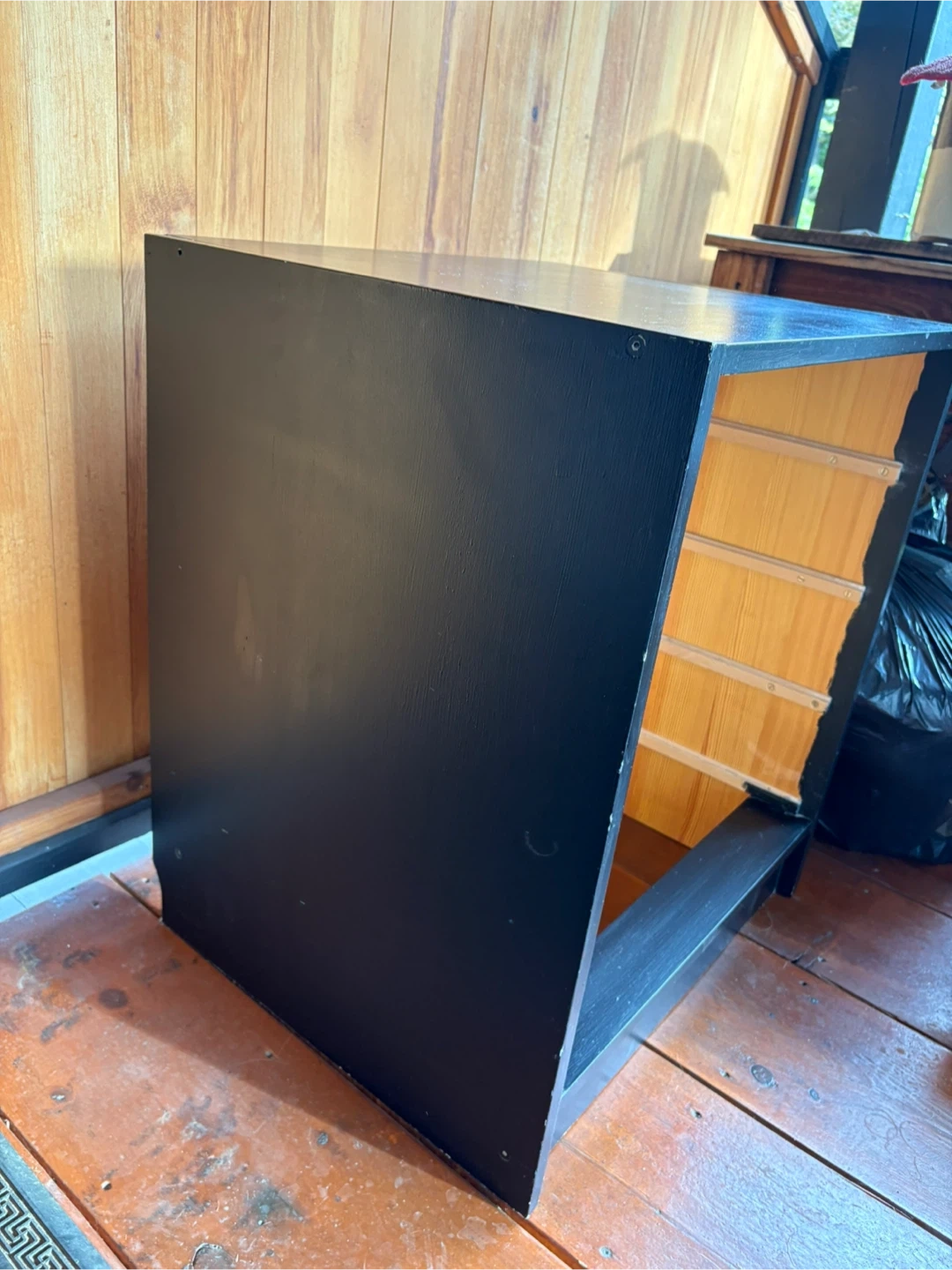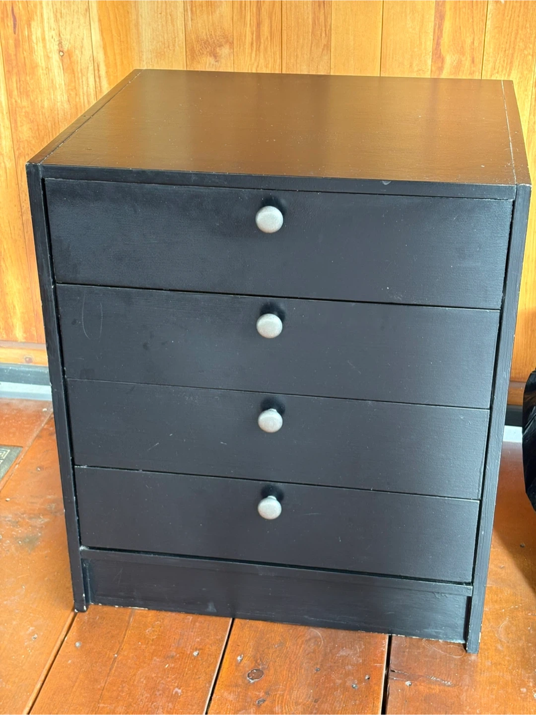 Selling a black dresser with four drawers. It has a few scratches but is otherwise in good condition. Perfect for extra storage in a bedroom or closet. Fresh coat of paint would cover the few small marks!