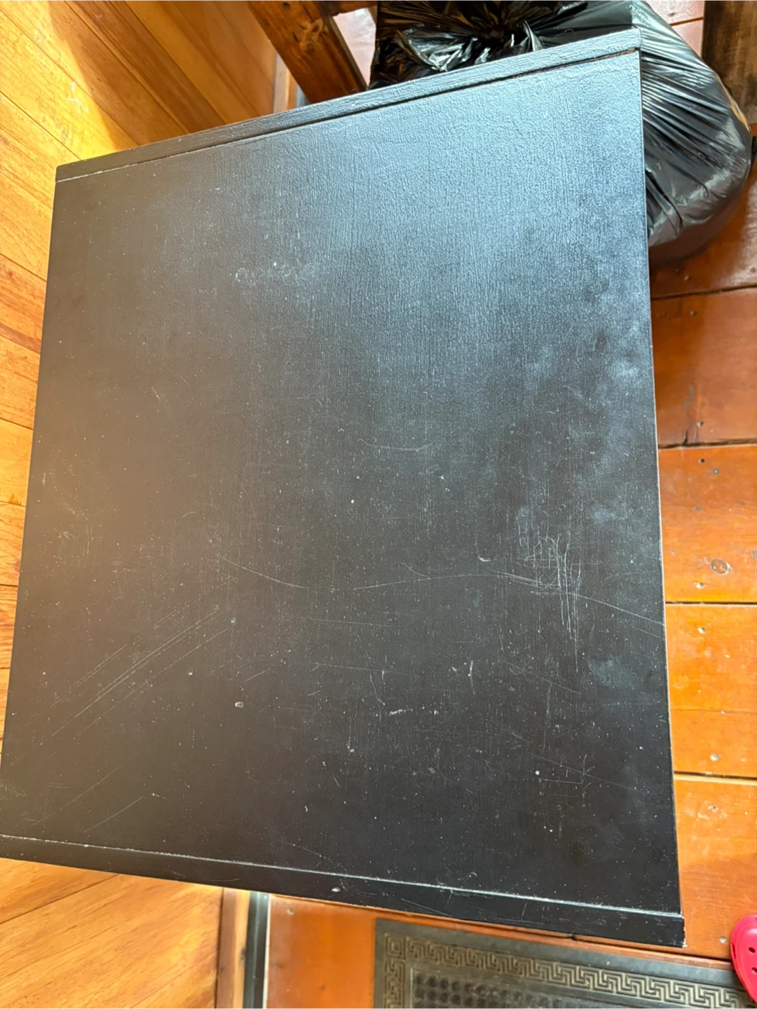 Selling a black dresser with four drawers. It has a few scratches but is otherwise in good condition. Perfect for extra storage in a bedroom or closet. Fresh coat of paint would cover the few small marks!