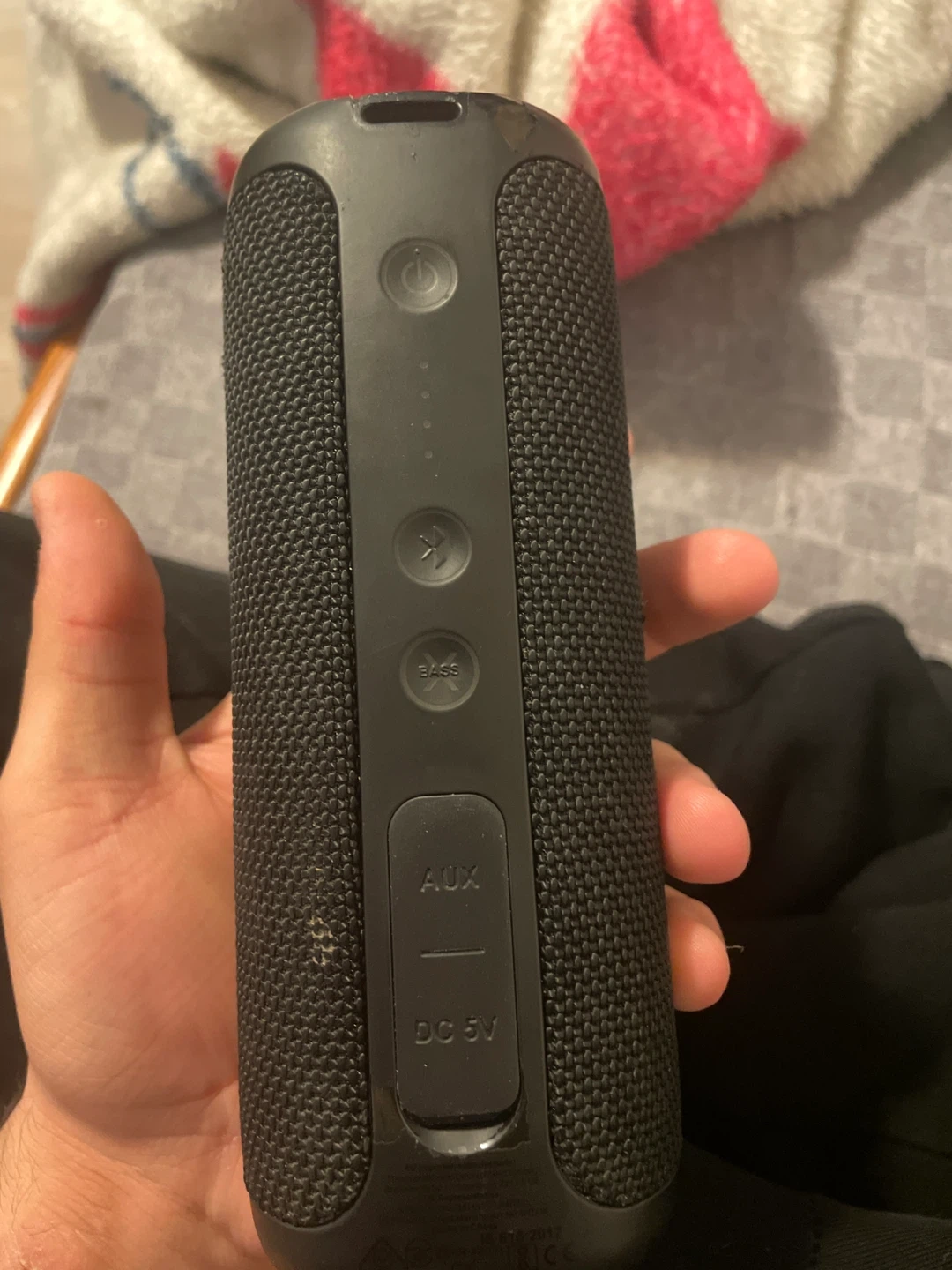 This is a black Tribit stormbox Bluetooth speaker. It has physical buttons for power, volume, and bass. It also includes an AUX input and DC 5V charging port. Water resistance and can last up to 38 hours on full charge and Great for enjoying music on the go!