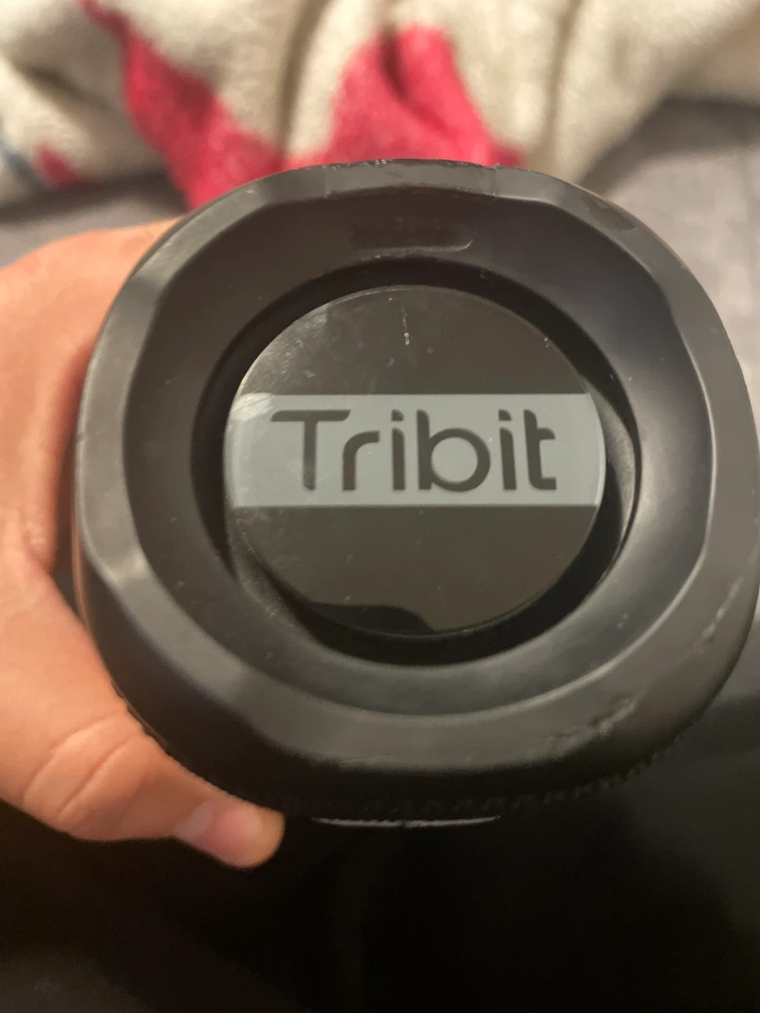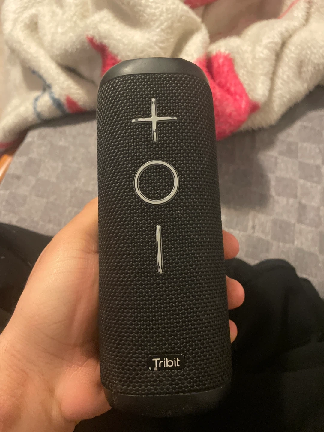 This is a black Tribit stormbox Bluetooth speaker. It has physical buttons for power, volume, and bass. It also includes an AUX input and DC 5V charging port. Water resistance and can last up to 38 hours on full charge and Great for enjoying music on the go!