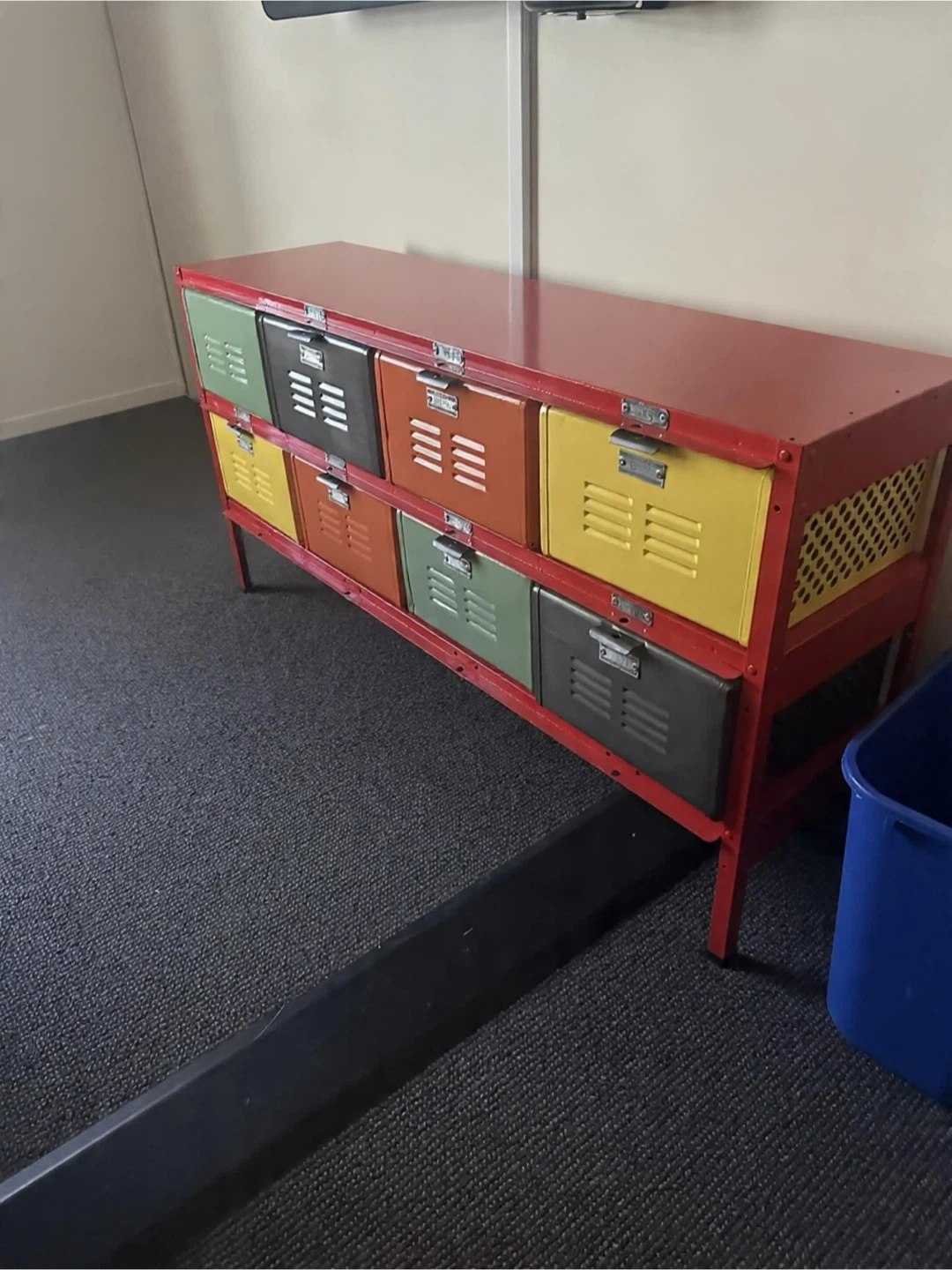 This vintage-style storage cabinet features a red metal frame and a multi-coloured drawer front. It has 12 drawers in total, organized in three rows of four. The drawers have a locker-style design with louvred fronts and small metal handles. It's a great piece for organizing items in a living room, bedroom, or office!