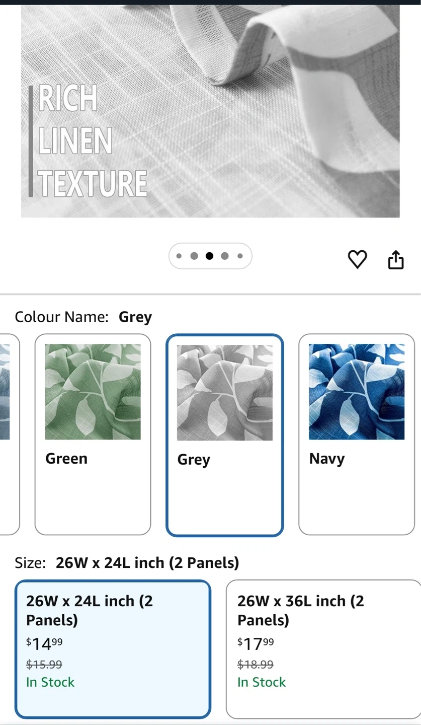 These grey curtains feature a leaf pattern with a rich linen texture. They measure 26 inches wide by 24 inches long, and come as a set of two panels. Great for adding a touch of nature to your room!