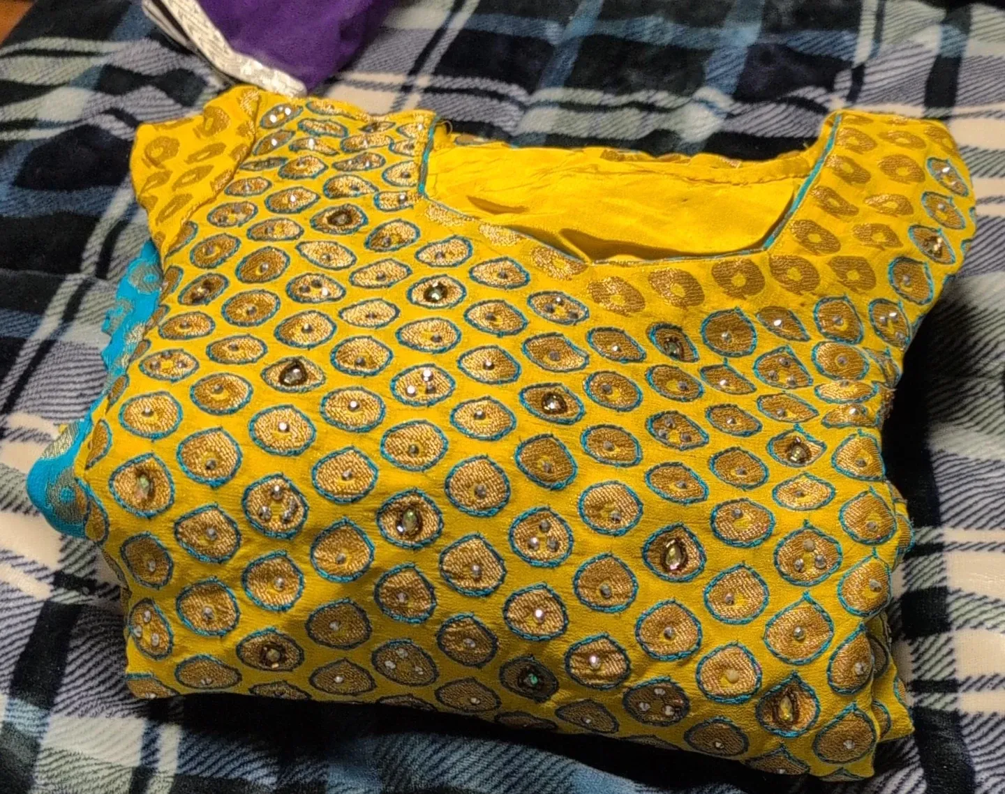 This yellow blouse features an intricate pattern of gold embroidery and blue accents. It's adorned with small, sparkling sequins. The material feels like a silk blend.