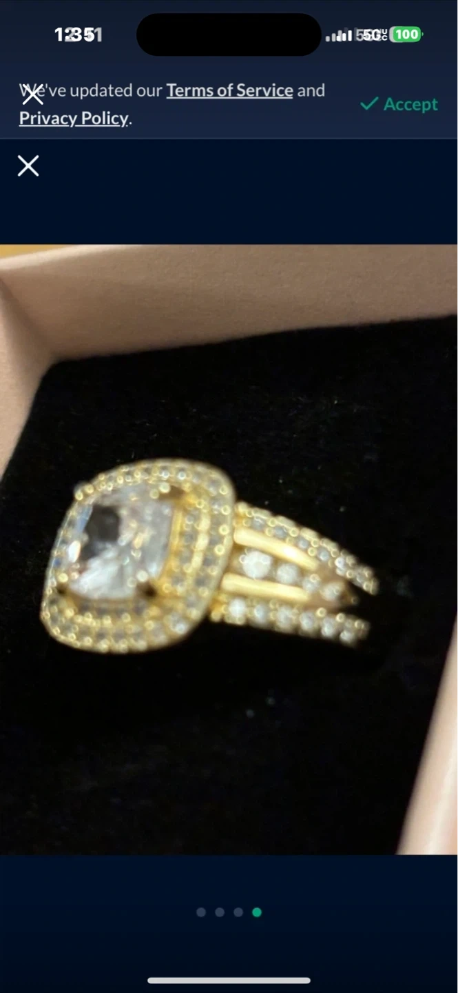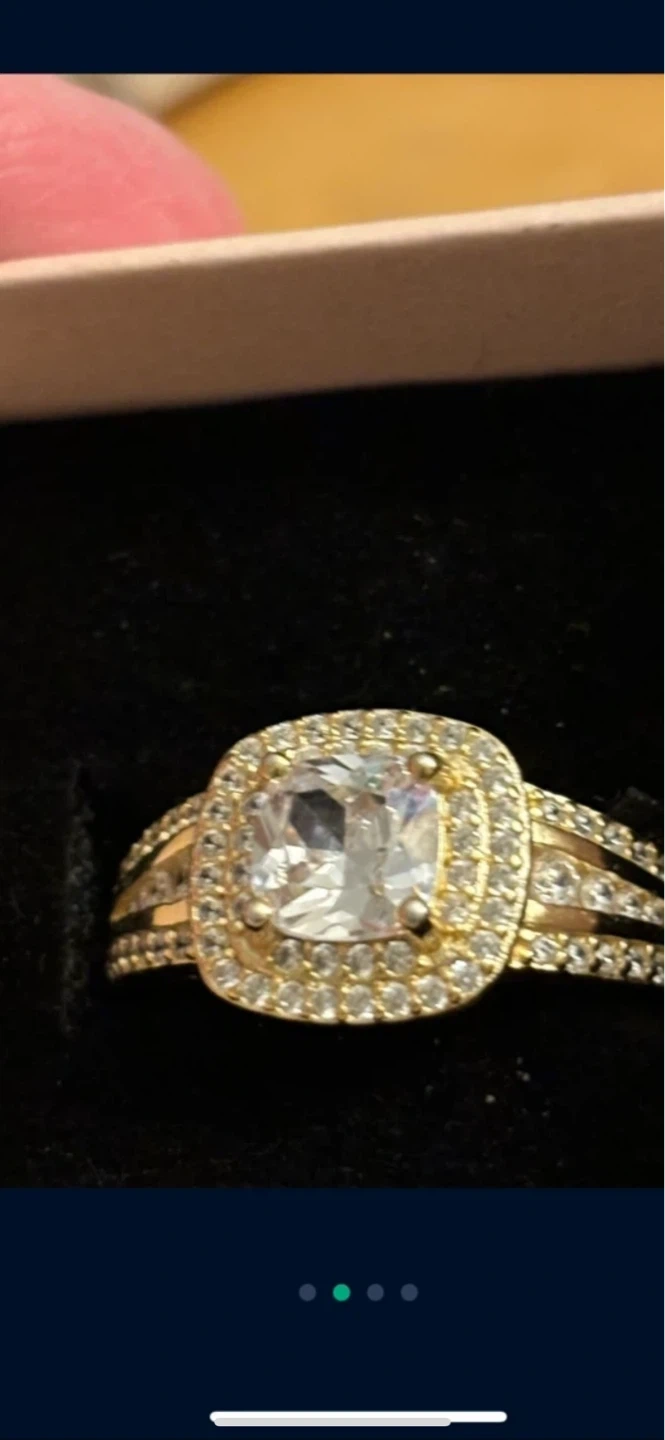 Sparkling gold 14 K ring featuring a central cushion-cut clear stone surrounded by a halo of smaller stones. The band has a split design embellished with additional clear accent stones. Size 12