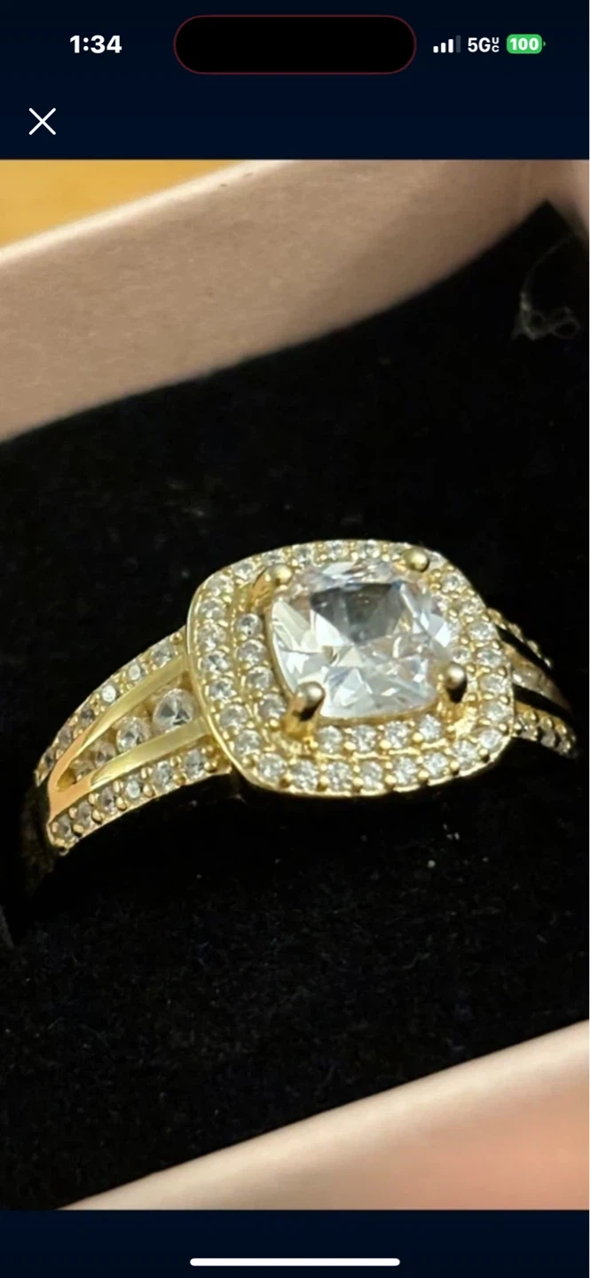 Sparkling gold 14 K ring featuring a central cushion-cut clear stone surrounded by a halo of smaller stones. The band has a split design embellished with additional clear accent stones. Size 12