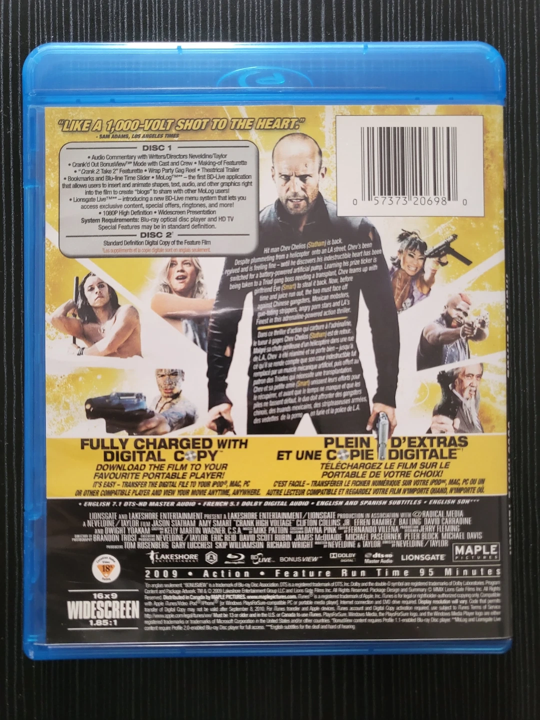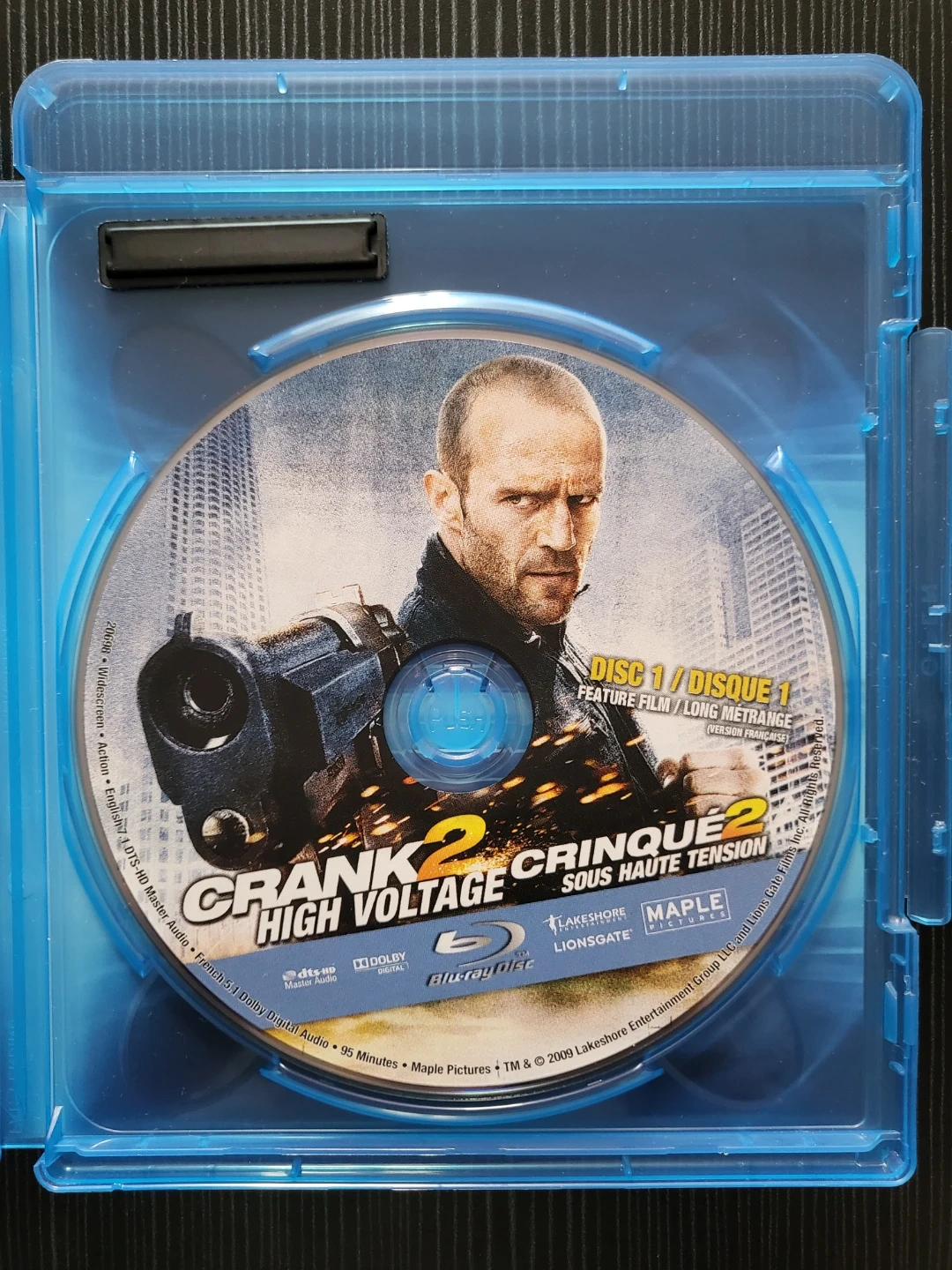 This Blu-ray disc features Crank 2: High Voltage, starring Jason Statham. It includes Disc 1 with the feature film and bonus content, and Disc 2 with the digital copy.