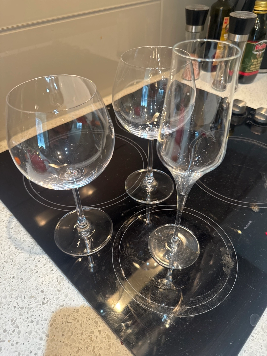 Set of three glassware pieces. Includes one large red wine glass, one smaller red wine glass, and one champagne flute. Clear glass. Excellent for entertaining Moving ASAP. Only pick up.