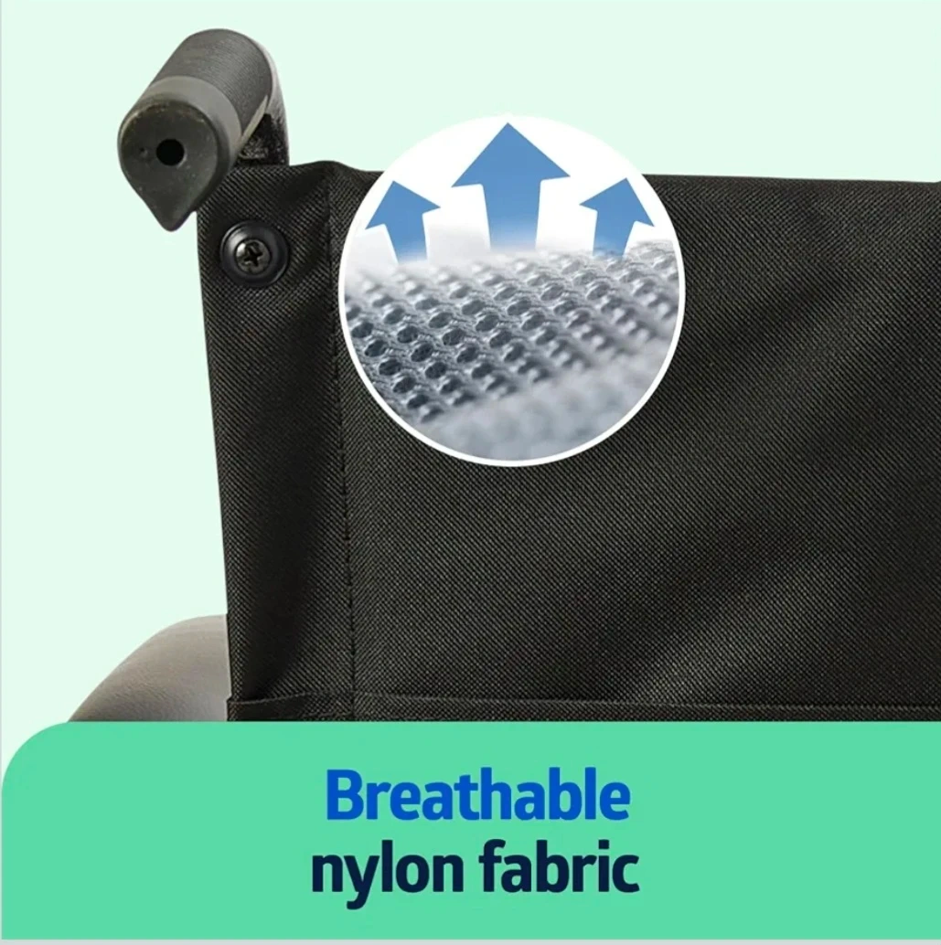 This Medline manual wheelchair features swing-back, desk-length arms for convenience. It's constructed with breathable nylon fabric for comfort and includes adjustable, elevating leg rests. The seat is 16" W x 16" D, and the overall height is 36.5".