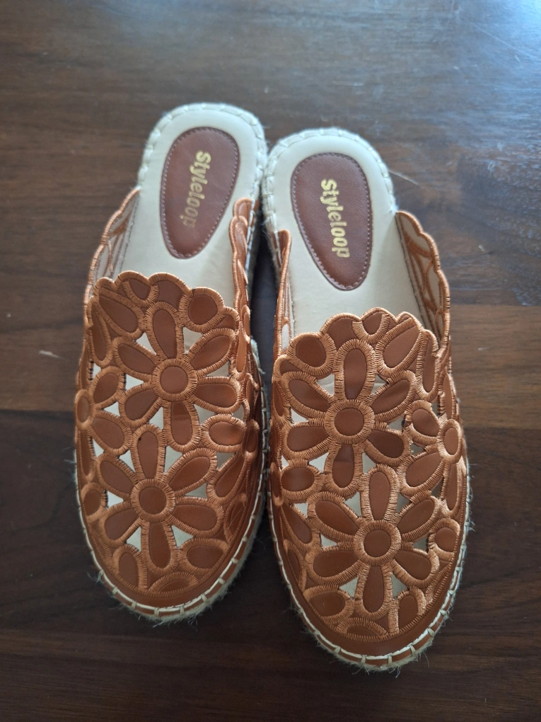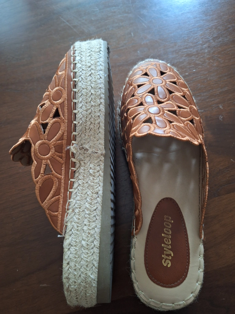 Cute brown espadrille mules. Floral cut-out design. Lightweight and comfortable. Great for summer. Barley worn. pick up in Toronto in Roncesvalles