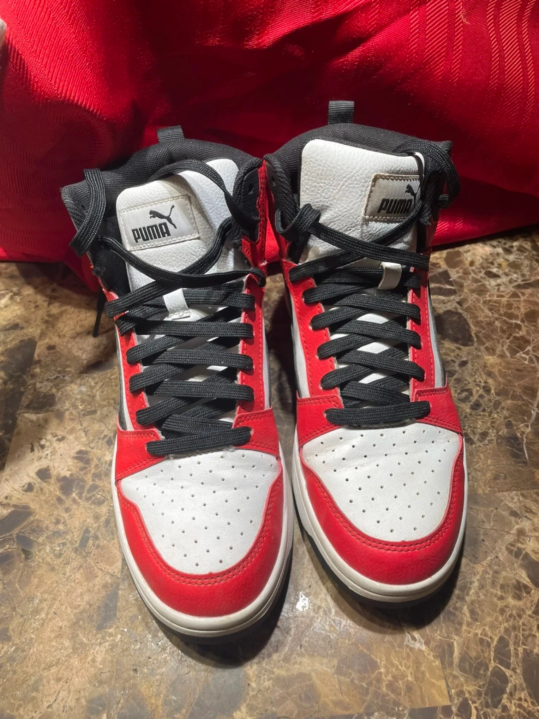 Puma high-top sneakers in a bold red, white, and black colourway. These kicks are size US 6, EUR 38, and UK 5. They're made in China with a synthetic and leather upper.