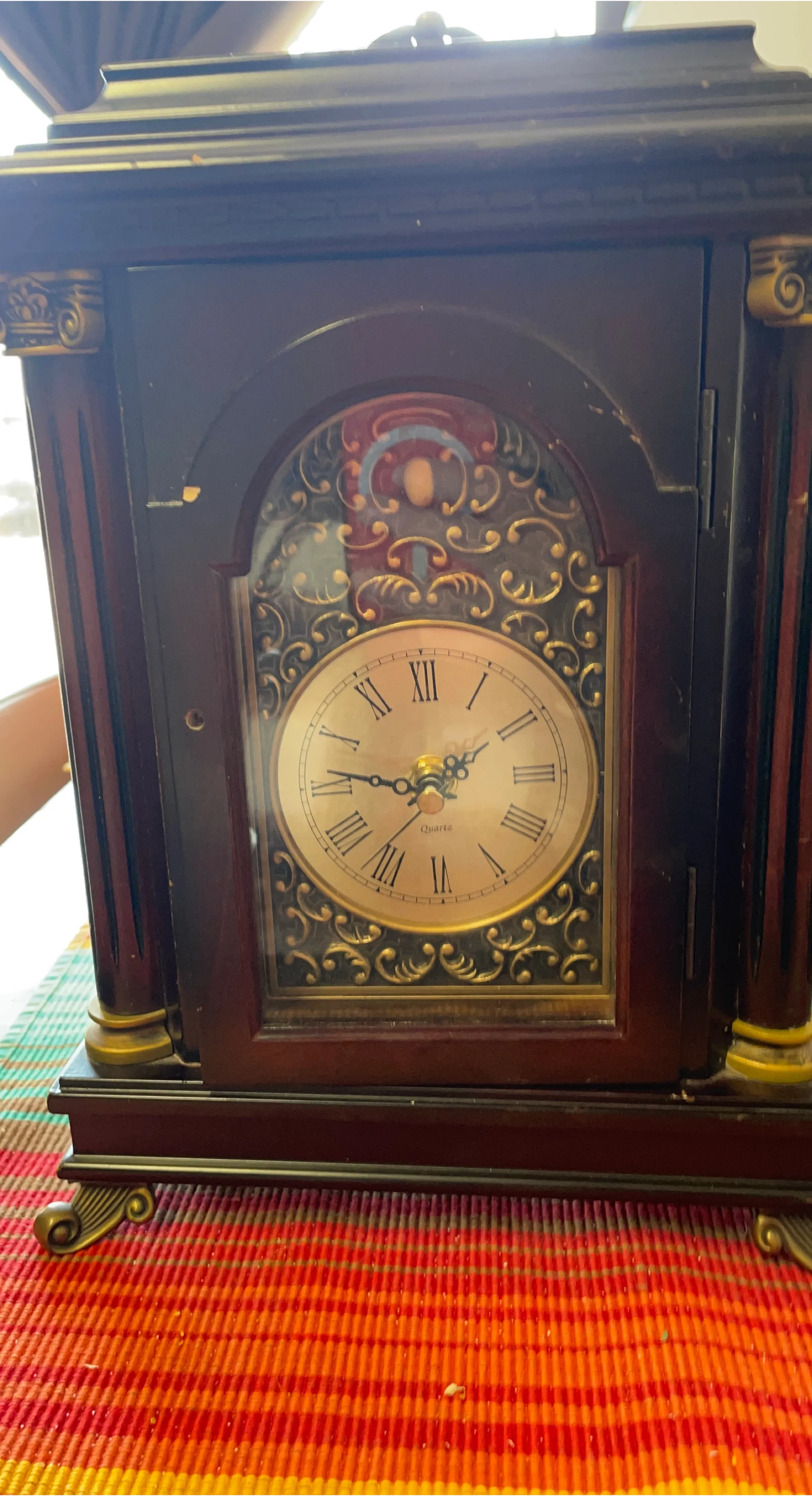 This is a dark wood mantel clock. It features a Quartz movement and Roman numerals on the face. The decorative gold accents add a classic touch. It would look great on a shelf or mantelpiece!