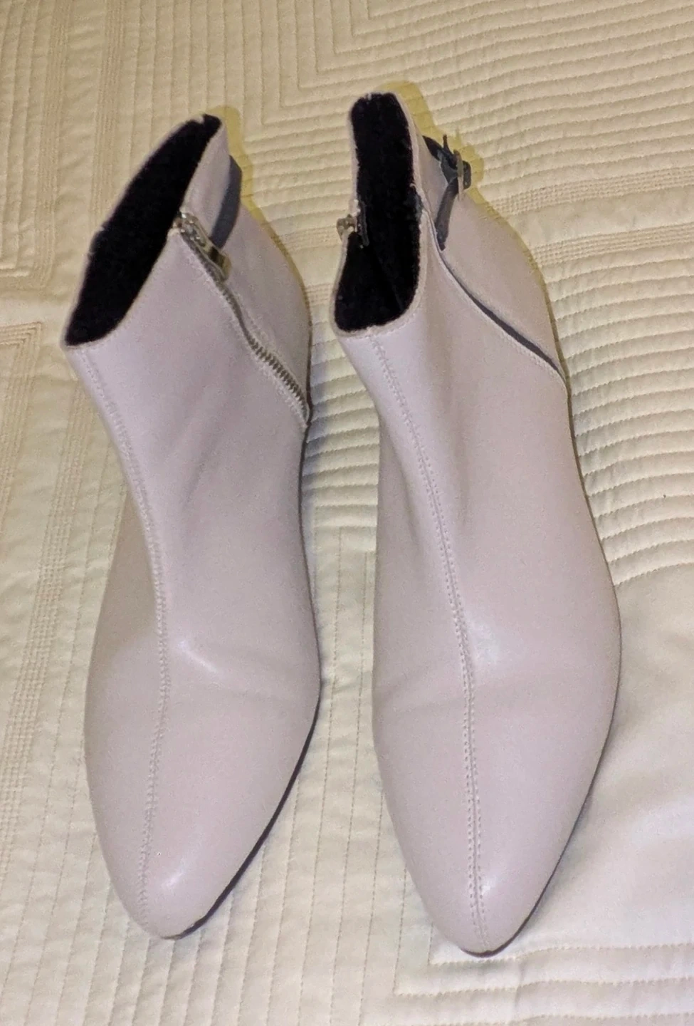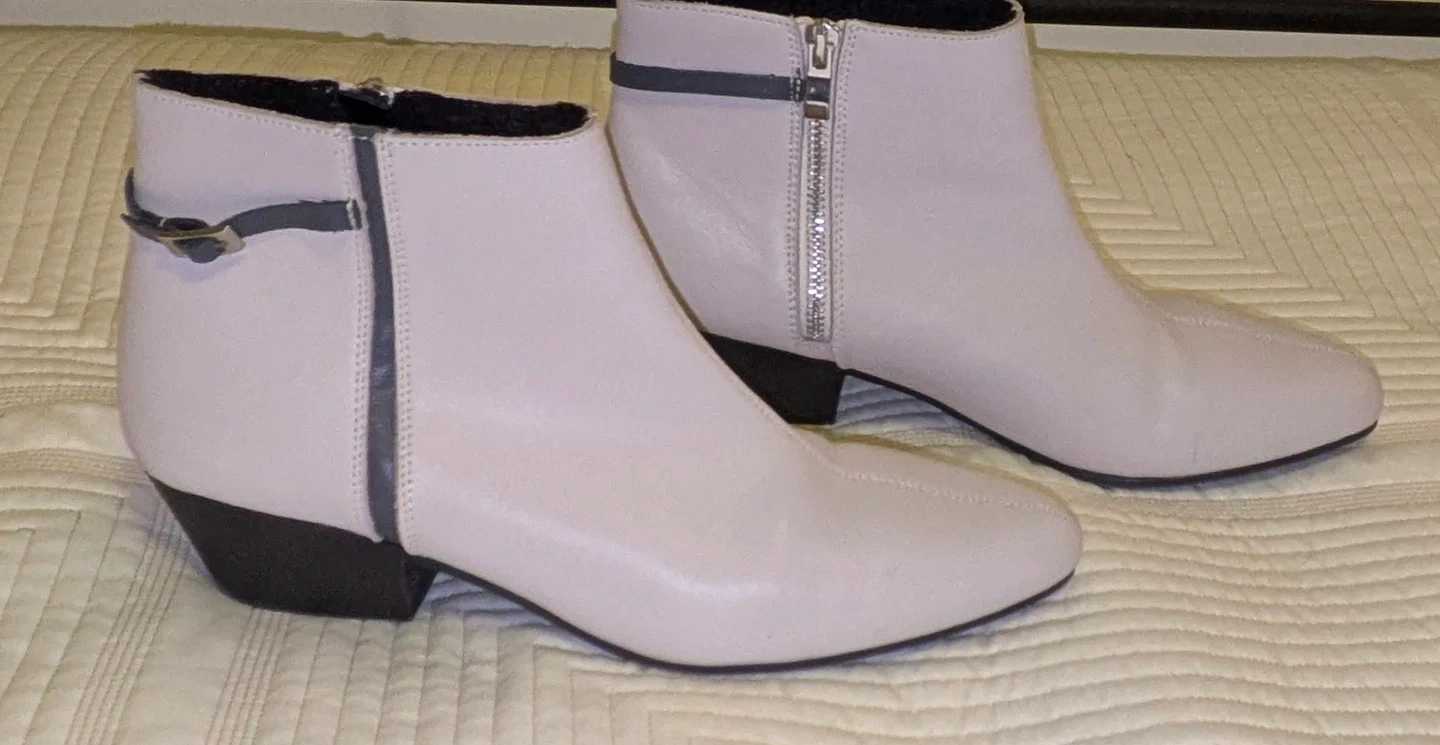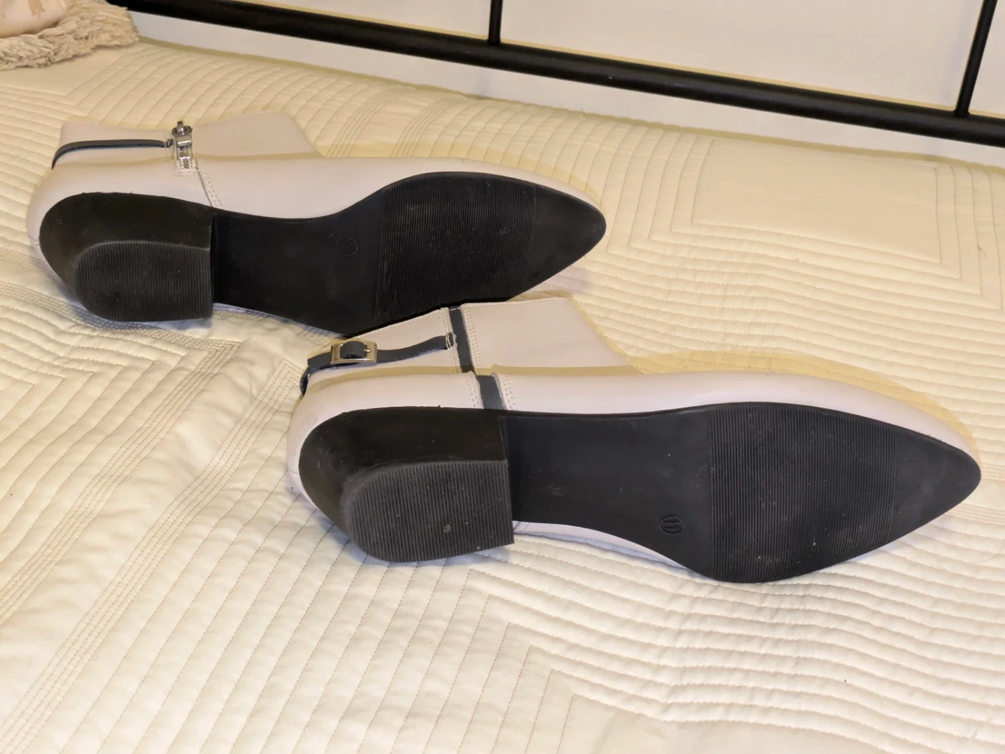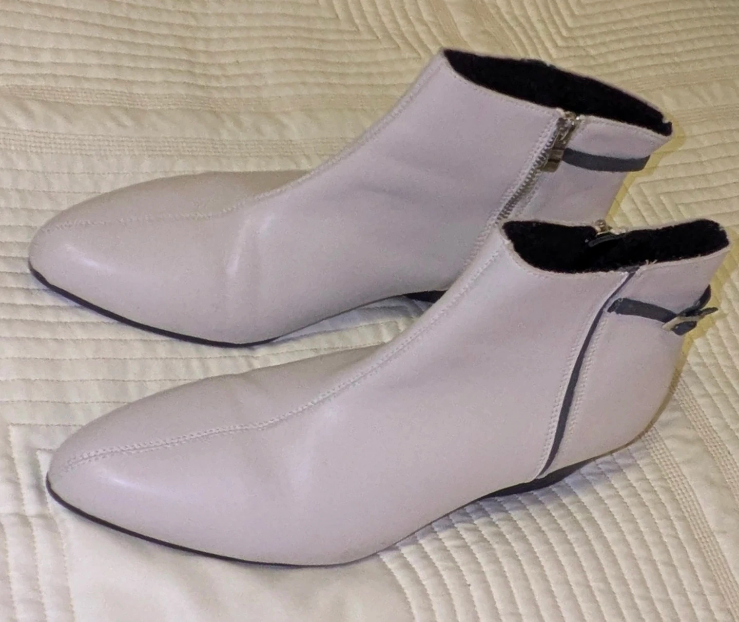 These are stylish, comfortable, and functional "Taffystep" stylish ankle boots in white with black accent colour. They have a side zipper and a low heel, are vegan and rainproof, and perfect for everyday wear. They are in great condition and and barely worn, with no damage or any wear, as you can note by the pictures and lack of wear on the sole.