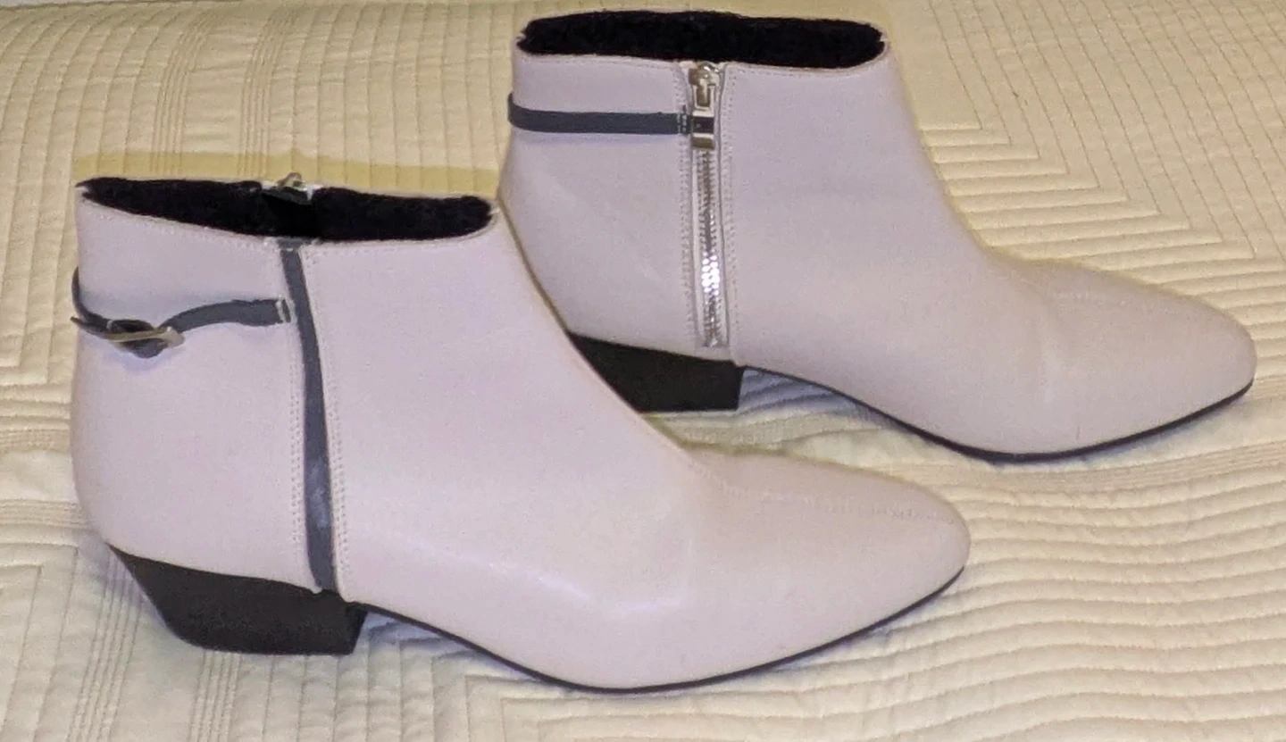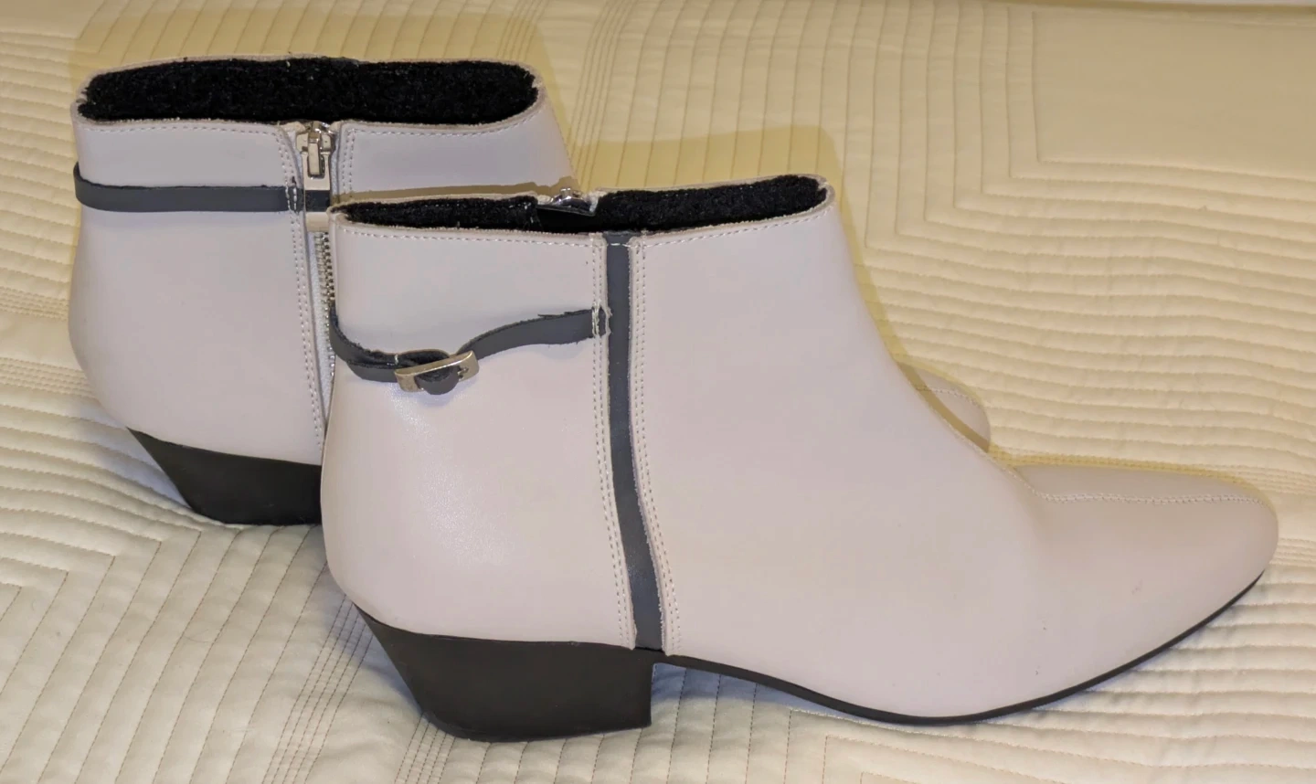 Vegan leather alternative white anklet boots with side zipper and black belted embellishment and heel. These are soft, lightweight, breathable, flexible, and water-resistant. A soft felt interior and tiny soft rubber heel and sole make them suitable for both rain or shine, for work or play, and super stylish with any cropped dress pant, jean, or legging.
