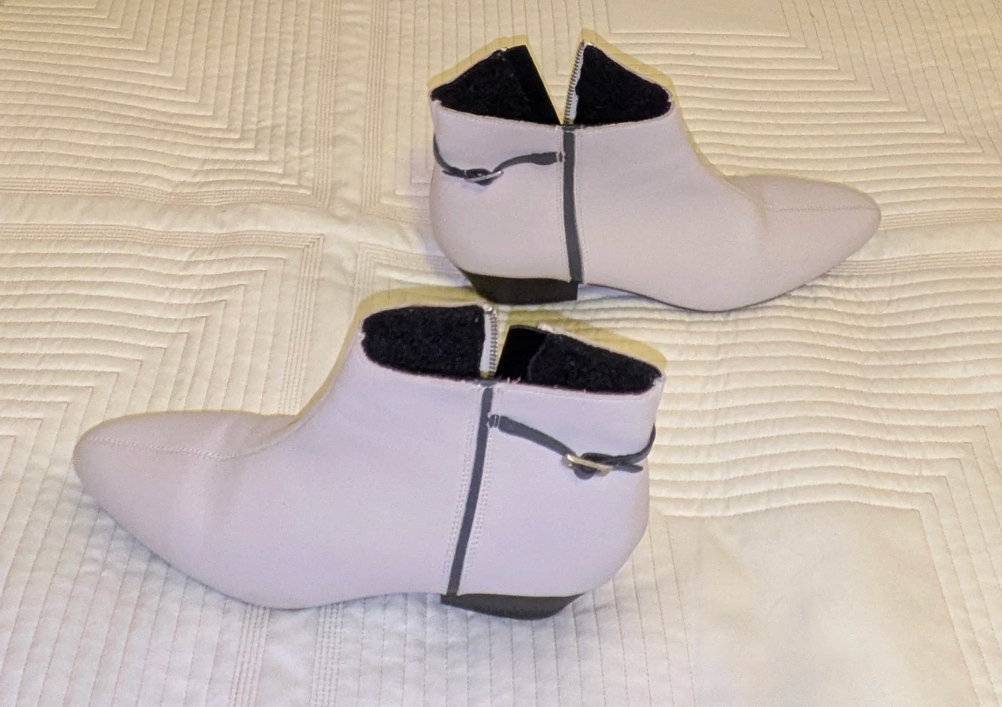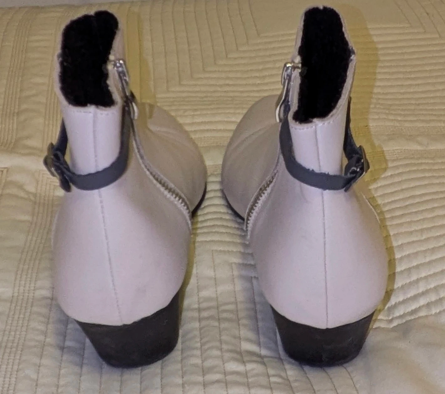 Vegan leather alternative white anklet boots with side zipper and black belted embellishment and heel. These are soft, lightweight, breathable, flexible, and water-resistant. A soft felt interior and tiny soft rubber heel and sole make them suitable for both rain or shine, for work or play, and super stylish with any cropped dress pant, jean, or legging.