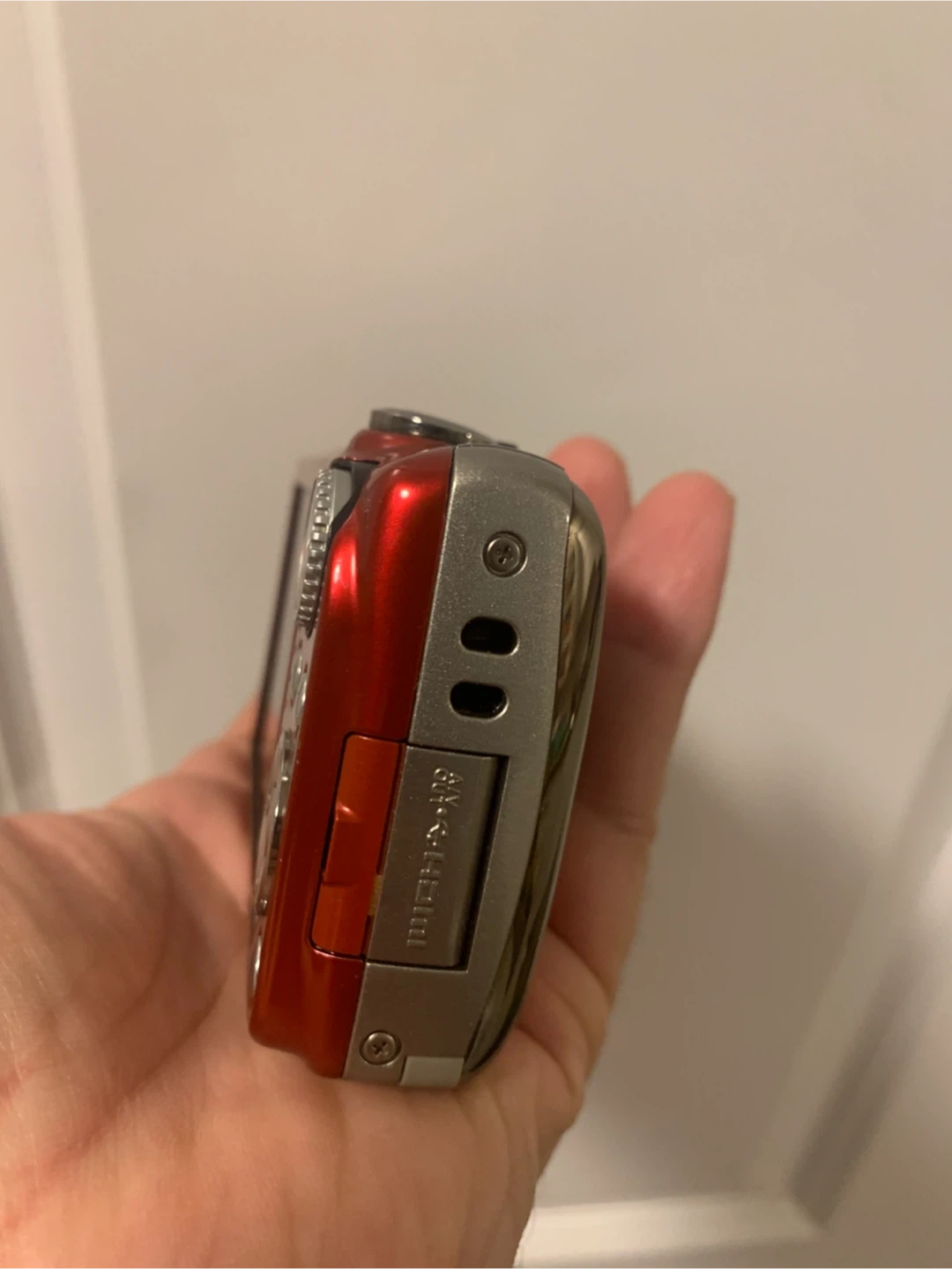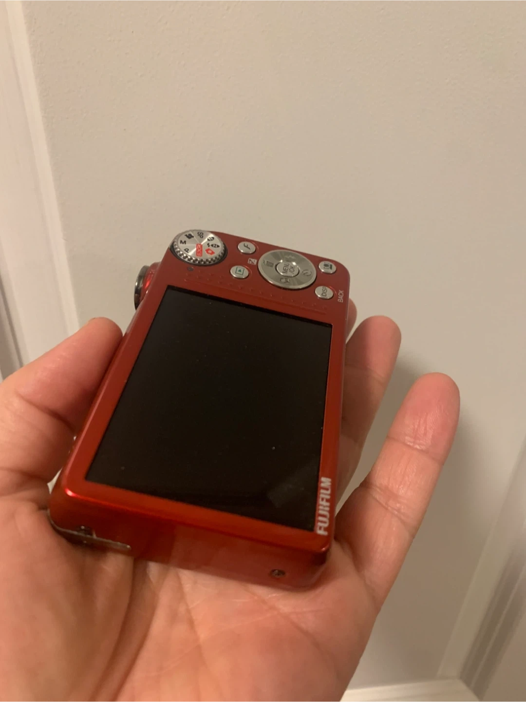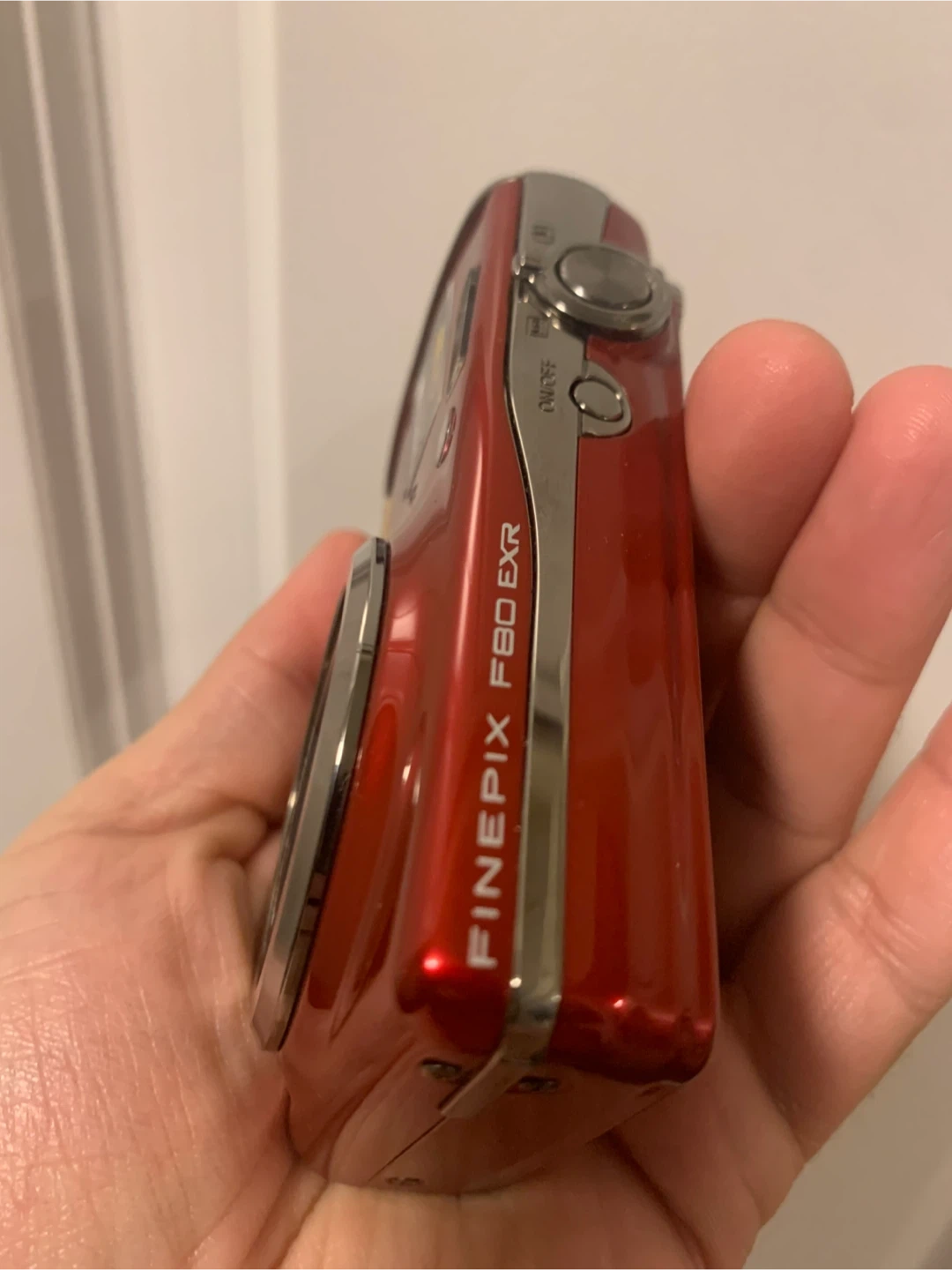 This is a red Fujifilm FinePix F80 EXR digital camera. It features 10x wide optical zoom and dual image stabilization. HD movie recording is supported.
