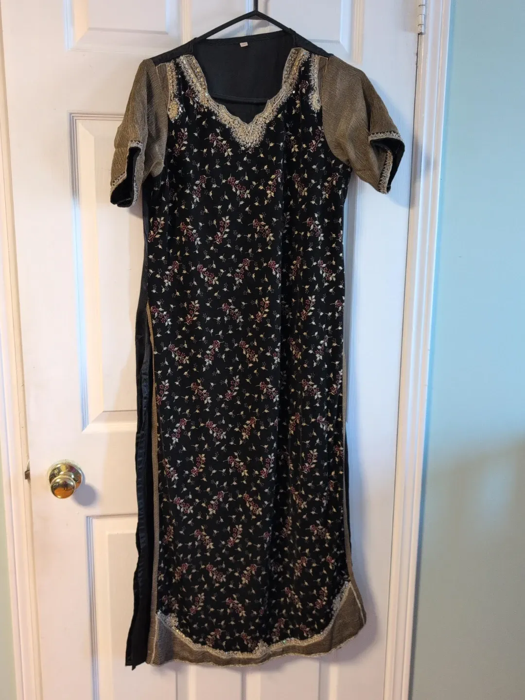 A black kurti or dress featuring a floral print. It has short sleeves with gold-toned fabric and detailed trim around the neckline and hem. This garment is suitable for casual wear.
