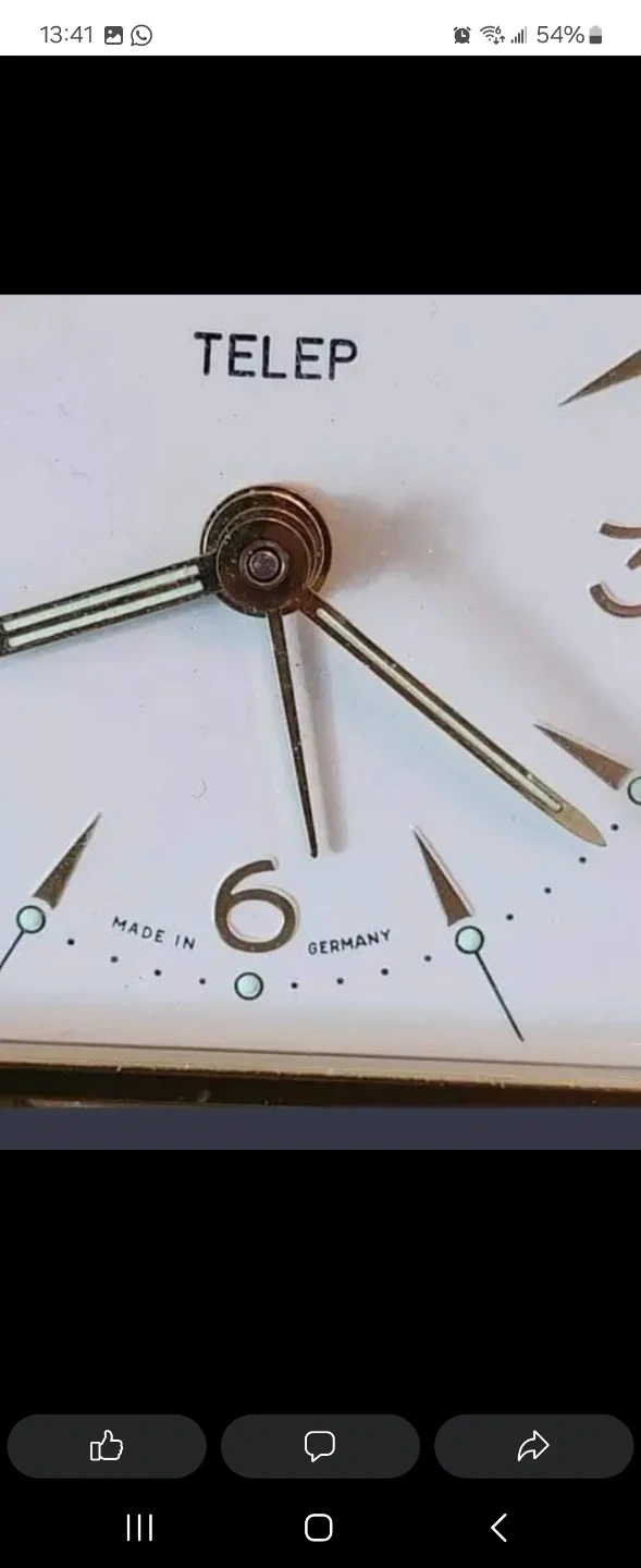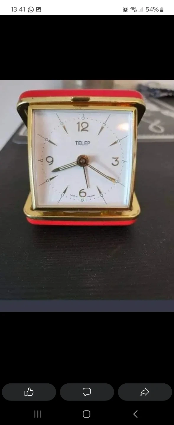 This is a vintage TELEP travel alarm clock. It's made in Germany and features a classic white face with gold-tone hands. It's a compact, folding design perfect for travel.