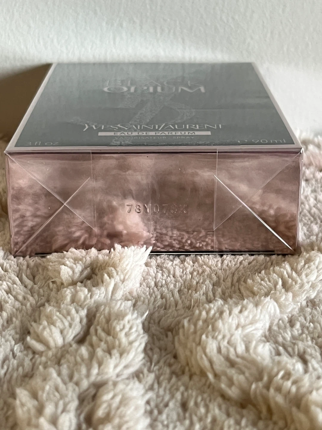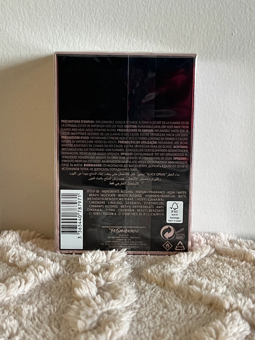 Yves Saint Laurent Black Opium Eau de Parfum. 3 fl oz, 90ml bottle. This scent features notes of coffee, white flowers, and vanilla.