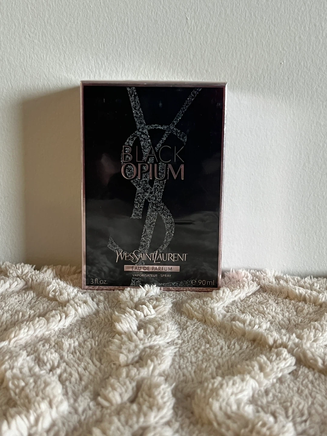 Yves Saint Laurent Black Opium Eau de Parfum. 3 fl oz, 90ml bottle. This scent features notes of coffee, white flowers, and vanilla.