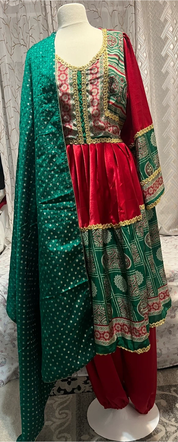 This is a beautiful red and green traditional outfit. It features vibrant colours and intricate gold trim. The outfit includes a matching green sequined scarf. Made with rich fabrics.