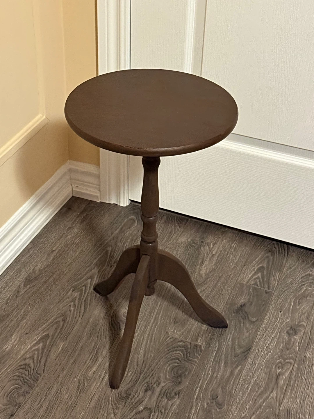 Brown wooden side table, perfect for adding a touch of charm to any room! It features a classic design with a round top and three legs. It's in good condition and ready to be a functional and stylish addition to your home!