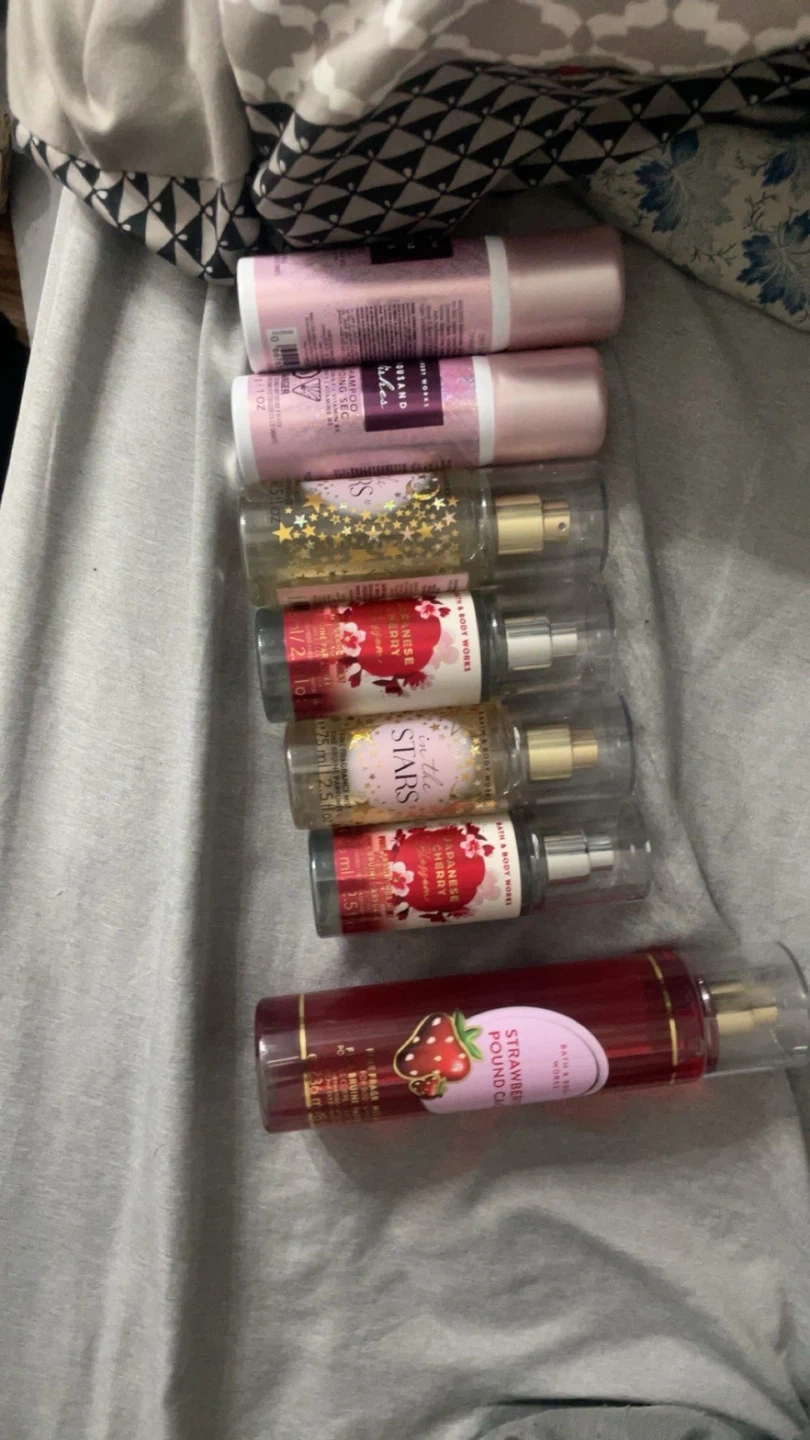 This lot includes five Bath & Body Works fragrance mists and two hair mists. Scents are Japanese Cherry Blossom, In the Stars, and Strawberry Pound Cake. Mists are 75ml or 2.5 fl oz, except for one larger Strawberry Pound Cake mist. One of the hair mists is the "A Thousand Wishes" scent. ( the strawberry pound cake mist is sold.) 2 for 15