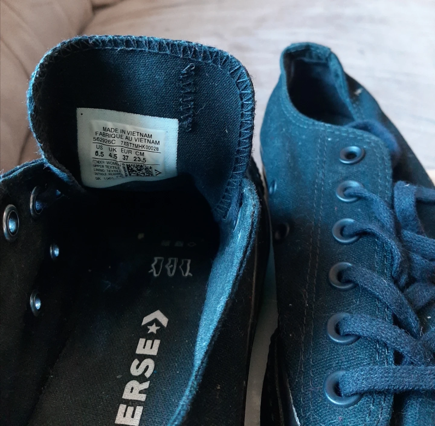 Black Converse platform sneakers. Women's US size 6.5, UK size 4.5, EUR size 37. These feature the classic Chuck Taylor design with a thick platform sole. They're made from canvas material.