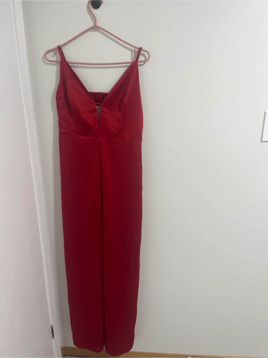 This wide leg satin jumpsuit from Dynamite is a stunning red colour. It features spaghetti straps and a cutout detail at the back. Satin material.brand new pick up cash only
